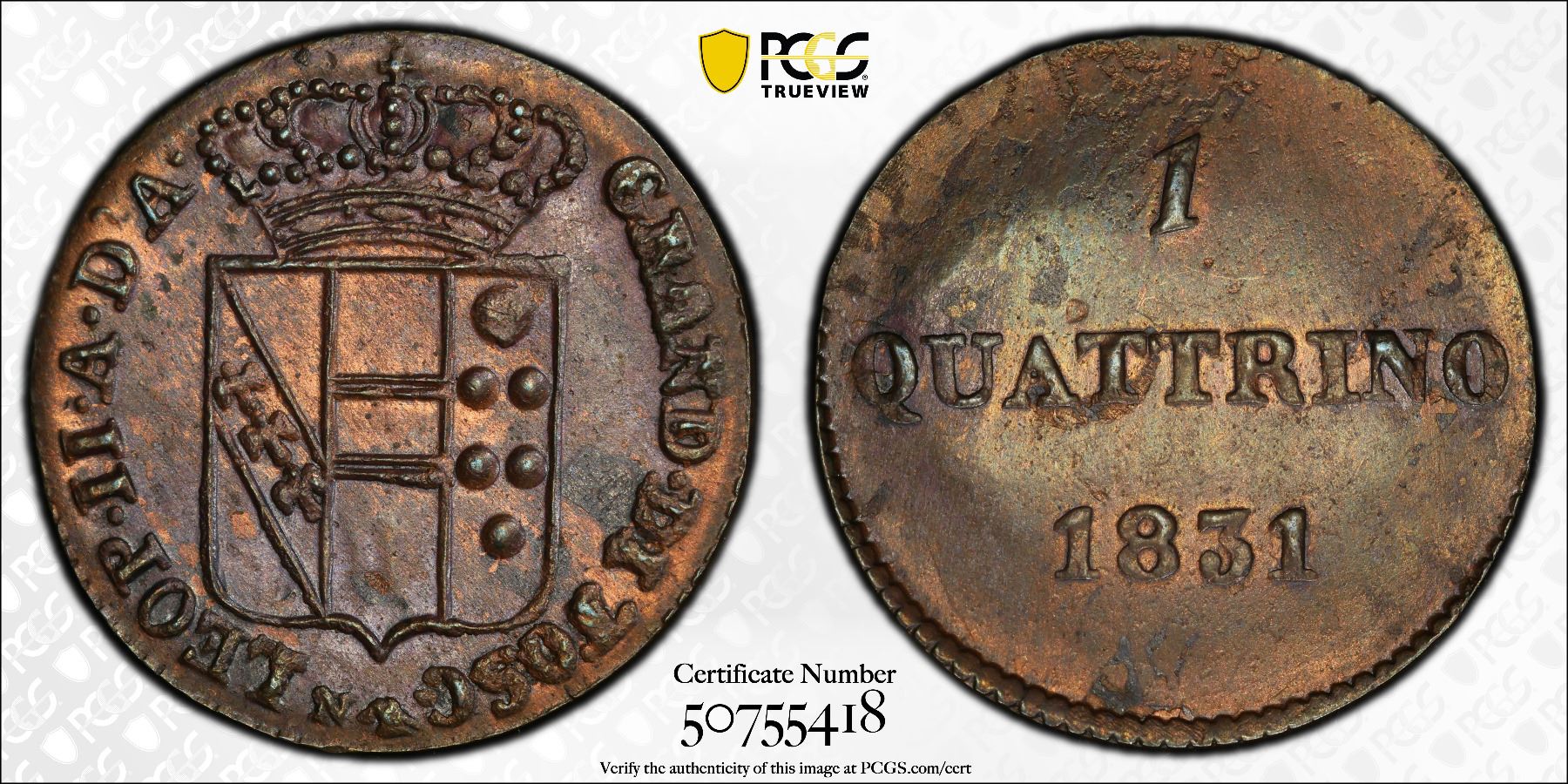 TUSCANY: Leopold II, 1824-1859, AE quattrino, 1831, Cr-62, a well struck example, environmental damage, PCGS graded UNC details.