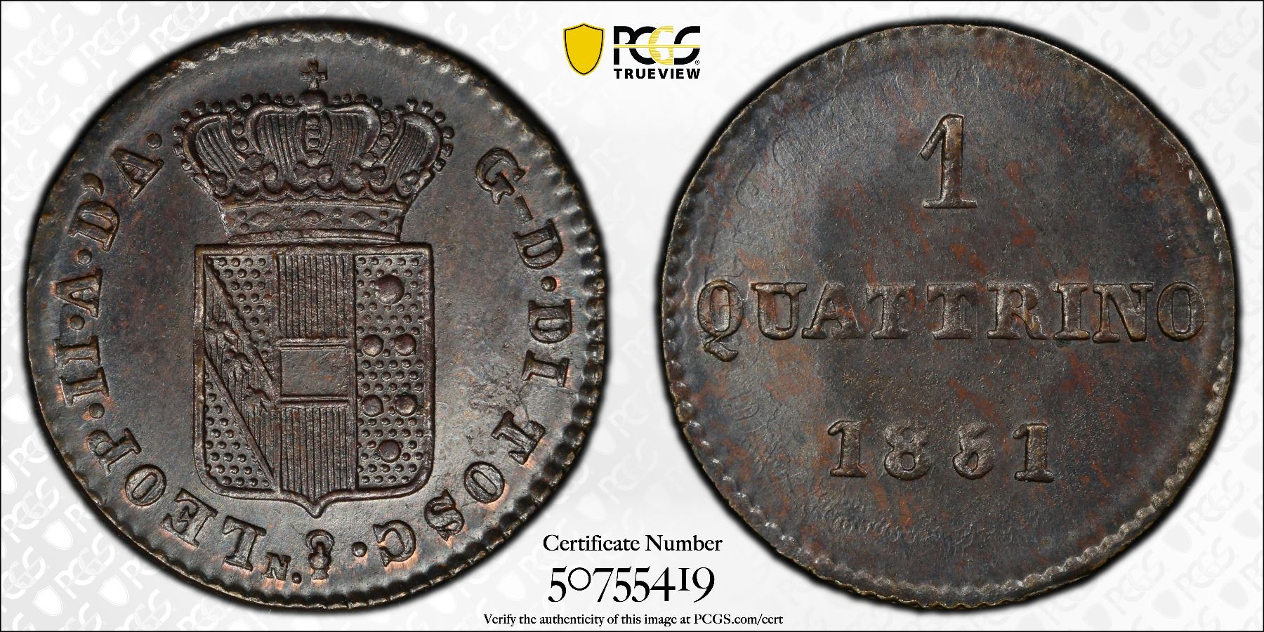 TUSCANY: Leopold II, 1824-1859, AE quattrino, 1851, PCGS MS63 BN