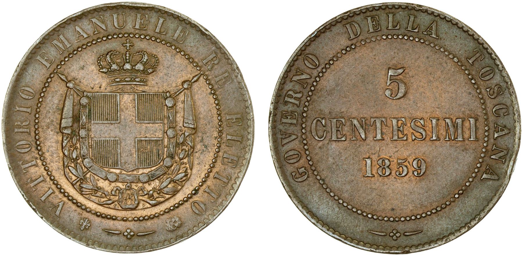 TUSCANY: Victor Emmanuel II, 1859-1860, AE 5 centesimi, 1859, AU