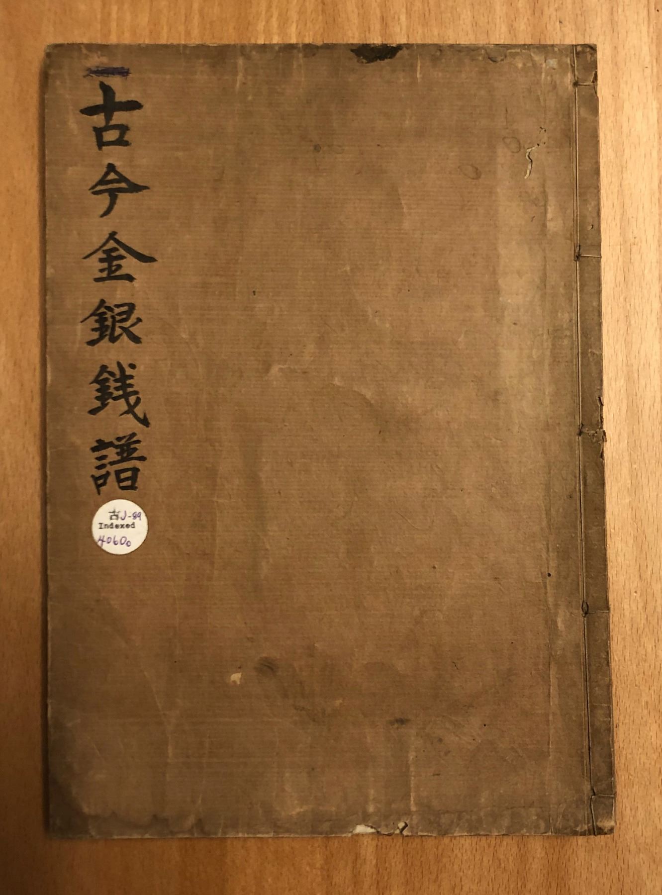 Taniguchi, Minsai, A Record of Ancient and Modern Gold and Silver Coins (Kokon kingin senpu), Enkyo year 3 (1746), 128 pages, softcover, yotsume toji (four-eye) binding. With approximately 200 hand-drawn illustrations of gold, silver and bronze coins, ex. H. F. Bowker Numismatic Library. Howard Franklin Bowker (1889-1970) was a numismatist and philatelist, collecting and specializing in Chinese coins, stamps and banknotes. He created the first bibliography of Western language publications on East Asian numismatics. Nakamura Fusetsu (1866-1943) was a Japanese painter in the yoga style. He was also known as a calligrapher. Kokotei is another name for Nakamura Fusetsu.