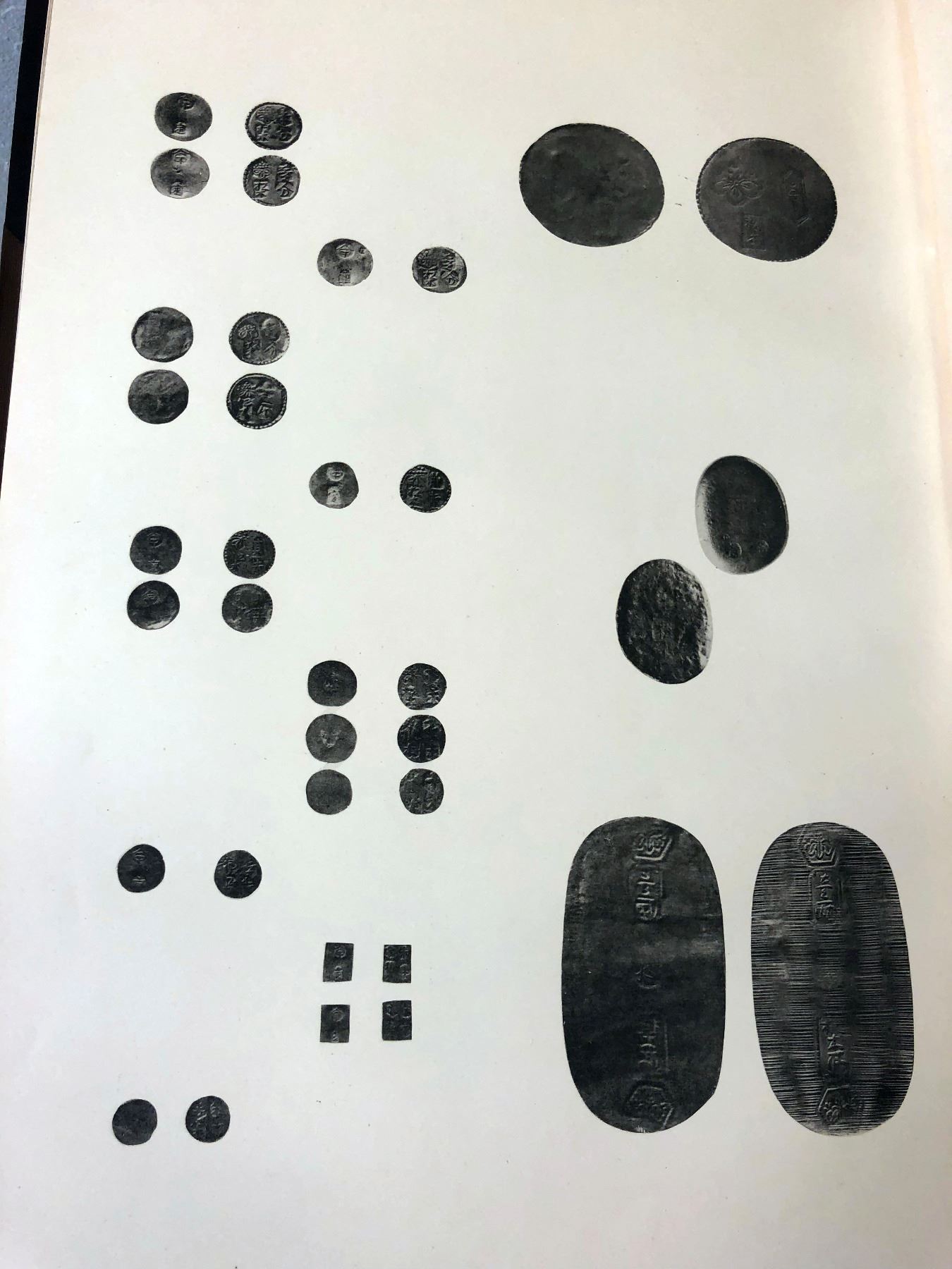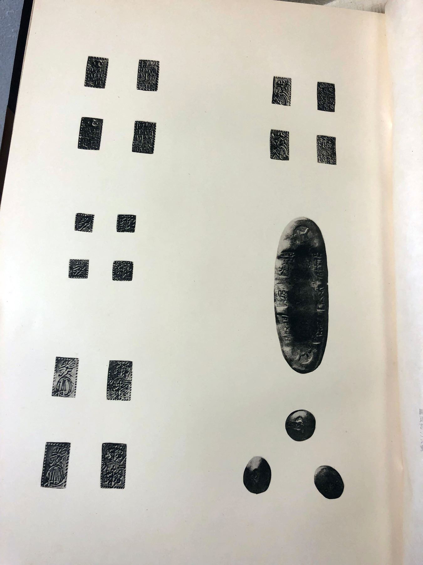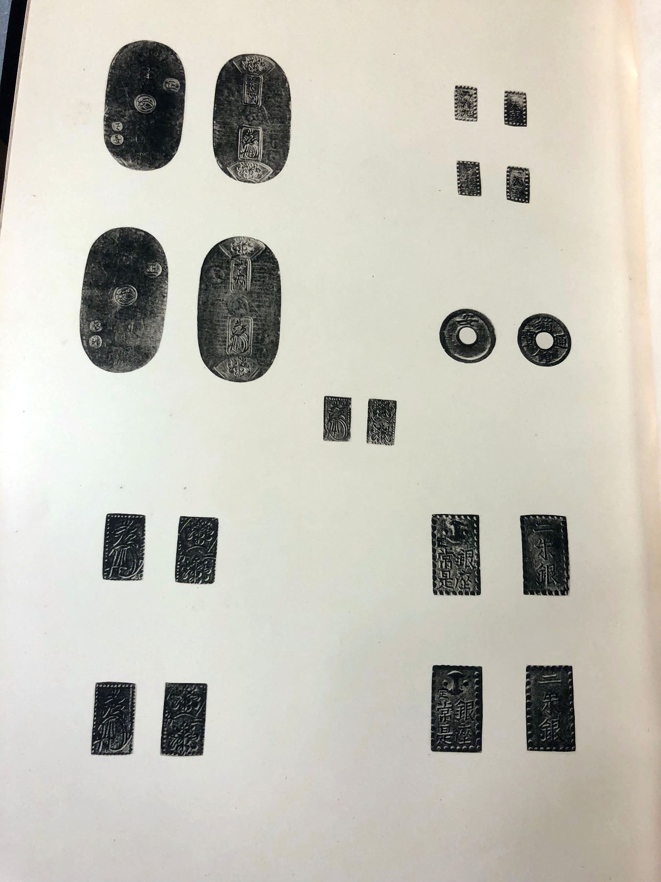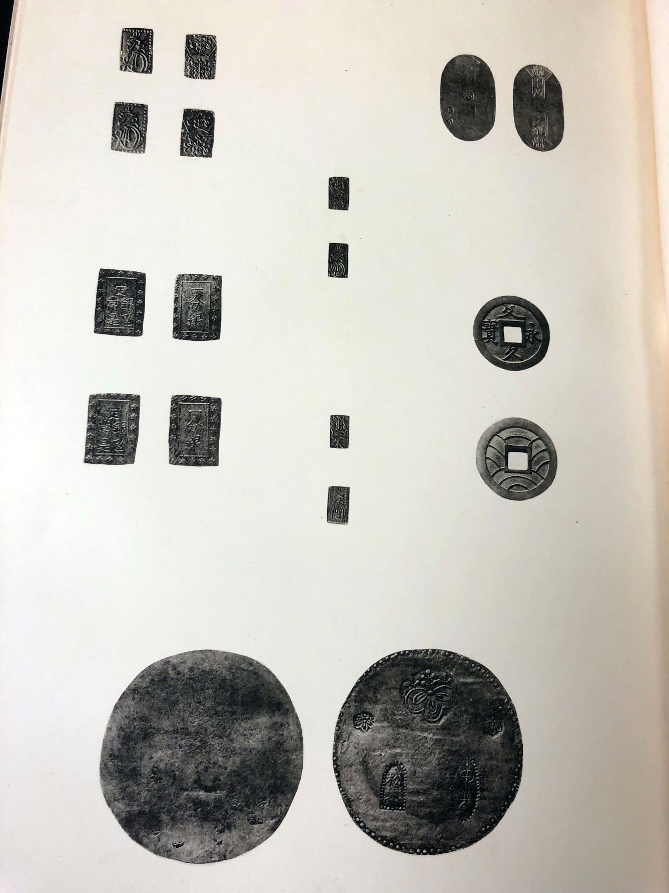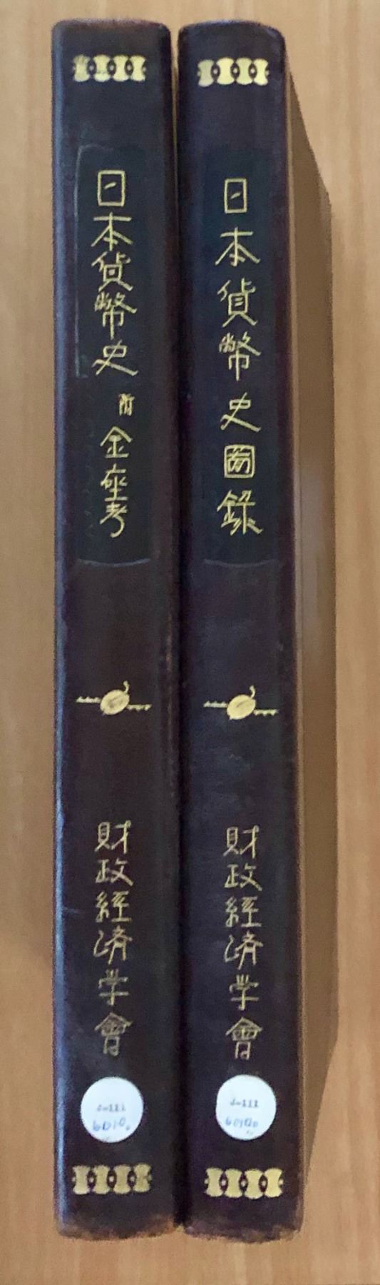 Tsukamoto, Toyojiro, The Old and New Coins of Japan (Nihon Kaheishi), Tokyo, Taisho year 14 (1925), 2 volume set, 286 pages, 295 plates, hardcover with slip cover for both volumes, enlarged and revised edition, published by the Tokyo Finance & Economic Society (Zaisei Keizai Gakukai), one volume mostly text and charts and the other with very good plates, one volume with broken spine but easily repaired, Japanese text, a very difficult to find book, ex. H. F. Bowker Numismatic Library. Howard Franklin Bowker (1889-1970) was a numismatist and philatelist, collecting and specializing in Chinese coins, stamps and banknotes. He created the first bibliography of Western language publications on East Asian numismatics.