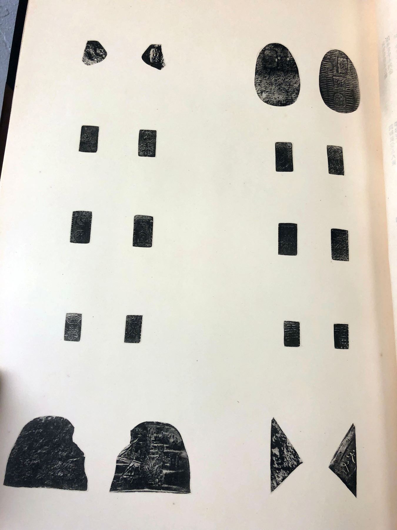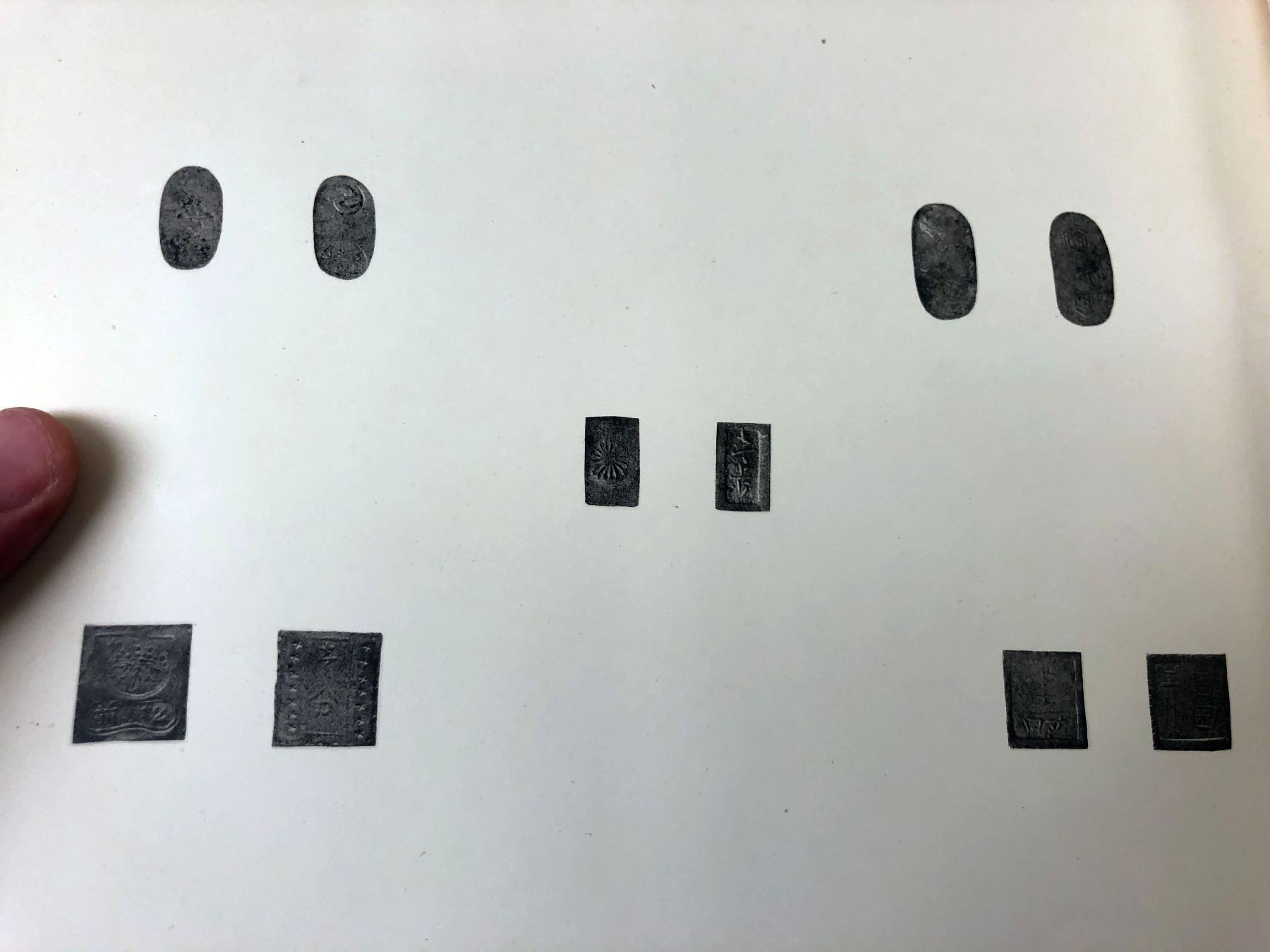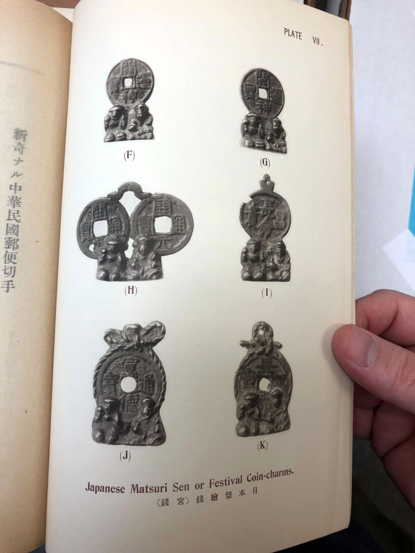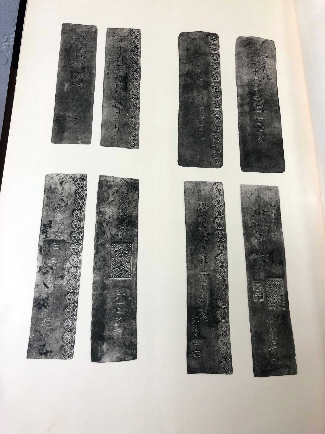 Tsukamoto, Toyojiro, The Old and New Coins of Japan (Nihon Kaheishi), Tokyo, Taisho year 14 (1925), 2 volume set, 286 pages, 295 plates, hardcover with slip cover for both volumes, enlarged and revised edition, published by the Tokyo Finance & Economic Society (Zaisei Keizai Gakukai), one volume mostly text and charts and the other with very good plates, one volume with broken spine but easily repaired, Japanese text, a very difficult to find book, ex. H. F. Bowker Numismatic Library. Howard Franklin Bowker (1889-1970) was a numismatist and philatelist, collecting and specializing in Chinese coins, stamps and banknotes. He created the first bibliography of Western language publications on East Asian numismatics.
