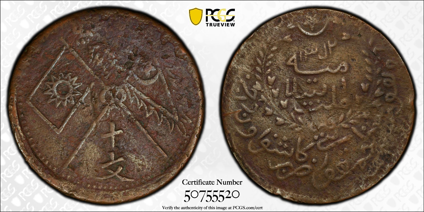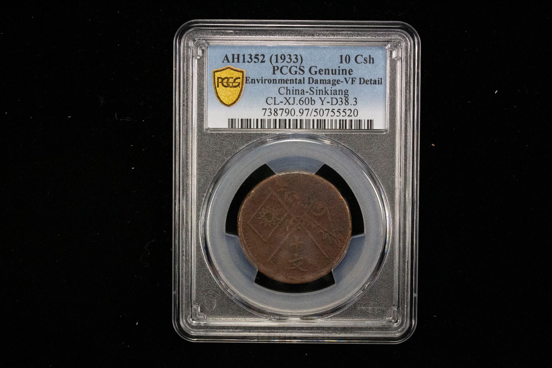 UIGHURISTAN: Hoja Niyaz Haji, 1933-1934, AE 10 cash, Kashgar, AH1352 (1933), Y-D38.3, CL-XJ.60b, crossed flags, denomination in Chinese below // uighuristan cumhuriyeti / miliyet islamiye (Islamic Republic of Uyghuristan) in Turki, date above, mint to lower left, a historic lustrous example, environmental damage, PCGS graded VF details. The First East Turkistan Republic, officially the Islamic Republic of East Turkistan, was a short-lived breakaway would-be Islamic republic founded on 12 November 1933. It was centered on the city of Kashgar in what is today the Xinjiang Uyghur Autonomous Region in China. With the sacking of Kashgar in 1934 by Hui warlords nominally allied with the Kuomintang government in Nanjing, the First East Turkistan Republic was effectively eliminated.
