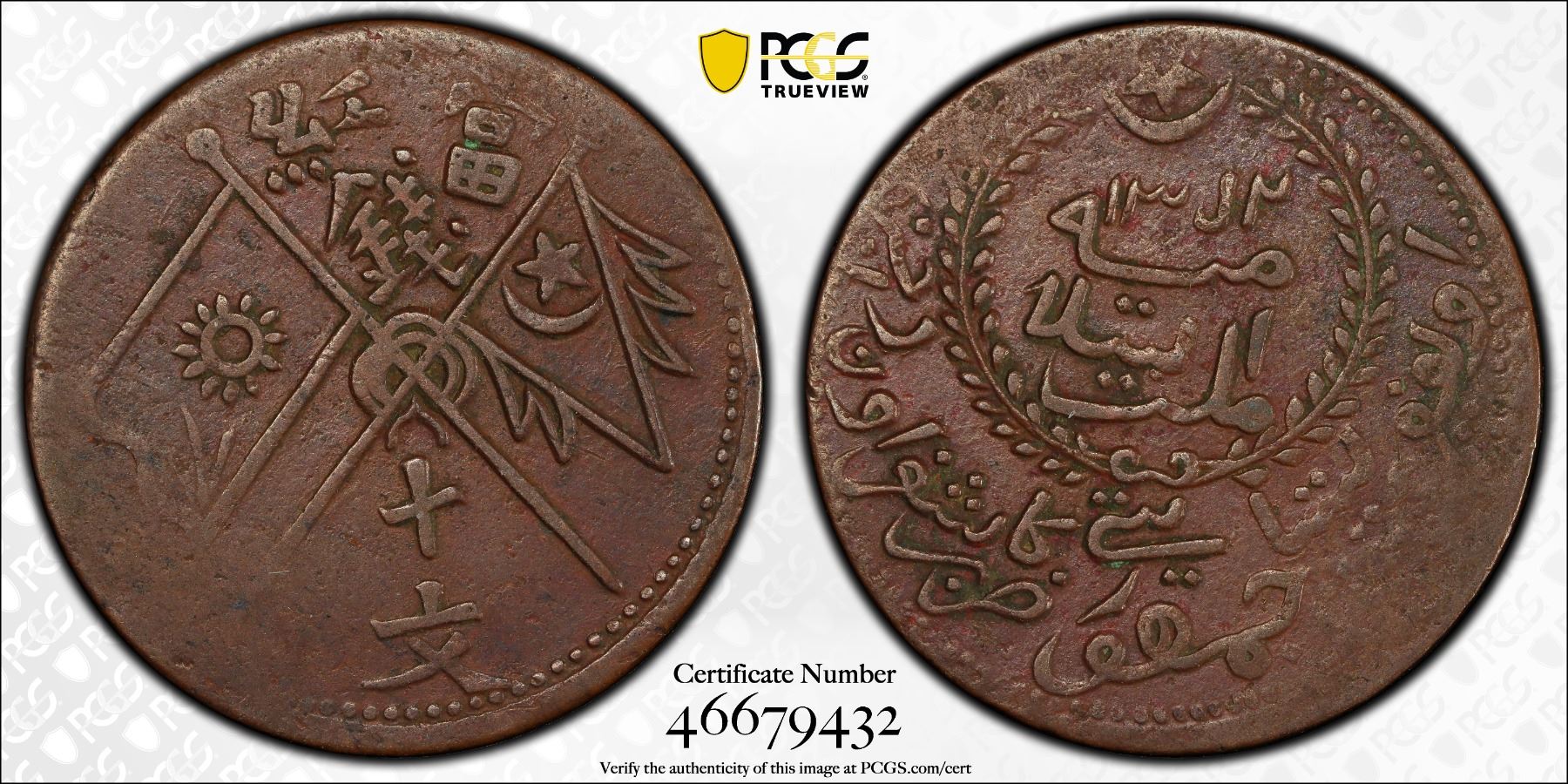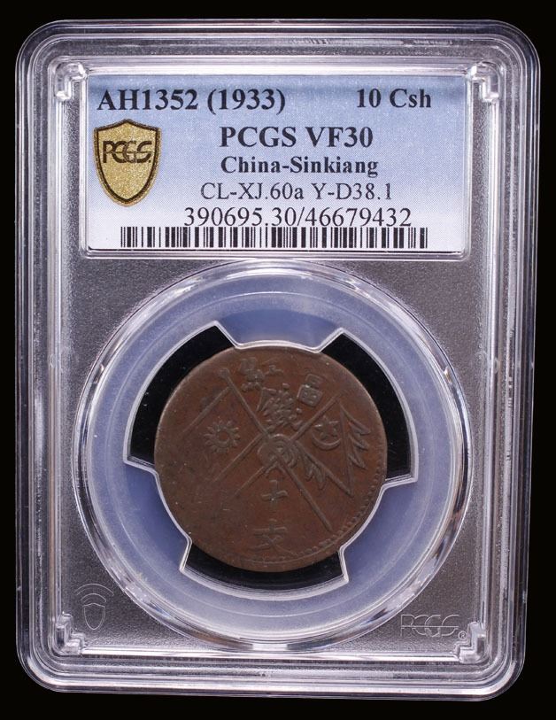 UIGHURISTAN: Hoja Niyaz Haji, 1933-1934, AE 10 cash, Kashgar, AH1352, Y-D38.1, CL-XJ.60a, star-and-crescent above Hijri date and Turki millet islamiye, all within wreath, uighuristan jumhuriyeti below, followed by mintname and denomination in Turki // crossed flags, denomination in Chinese above and below, an attractive example with an above-average strike and rich brown patina, PCGS graded VF30. The First East Turkistan Republic, officially the Islamic Republic of East Turkistan, was a short-lived breakaway would-be Islamic republic founded on November 12, 1933. It was centered on the city of Kashgar in what is today the Xinjiang Uyghur Autonomous Region in China. With the sacking of Kashgar in 1934 by Hui warlords nominally allied with the Kuomintang government in Nanjing, the First East Turkistan Republic was effectively eliminated.