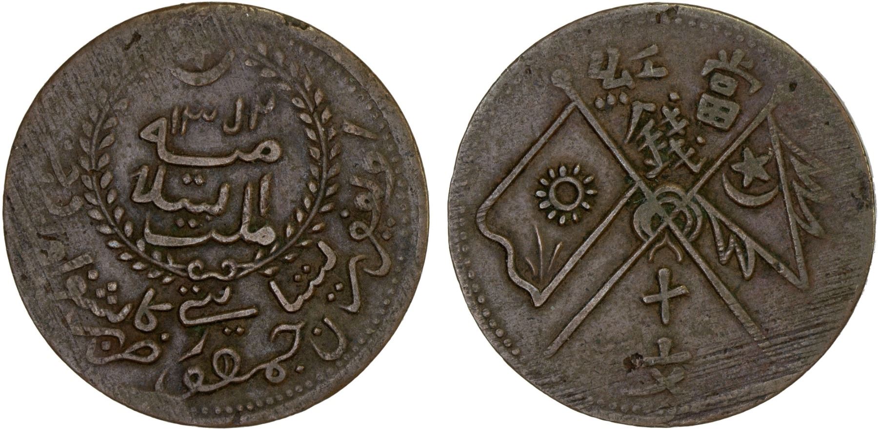 UIGHURISTAN: Hoja Niyaz Haji, 1933-1934, AE 10 cash, Kashgar, AH1352, Y-D38.1, CL-XJ.60a, star-and-crescent above Hijri date (obscured by weak strike) and Turki millet islamiye, all within wreath, uighuristan jumhuriyeti below, followed by mintname and denomination in Turki // crossed flags, denomination in Chinese above and below, an attractive example with an above-average strike, VF-XF. The First East Turkistan Republic, officially the Islamic Republic of East Turkistan, was a short-lived breakaway would-be Islamic republic founded on November 12, 1933. It was centered on the city of Kashgar in what is today the Xinjiang Uyghur Autonomous Region in China. With the sacking of Kashgar in 1934 by Hui warlords nominally allied with the Kuomintang government in Nanjing, the First East Turkistan Republic was effectively eliminated.