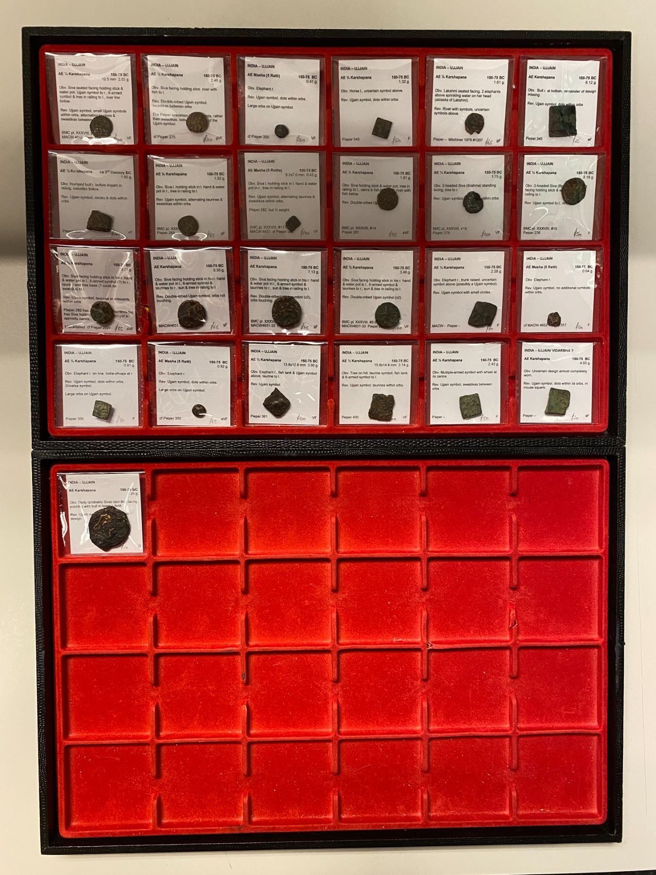 UJJAIN: LOT of 24 copper coins, many different types, including several with Shiva standing or seated, weights vary from about 0.4g to just over 6.0g, all with Todd's description and referrence (Pieper references to his old edition of 2013); average VG to Fine condition, a few worse, but several nicer and quite attractive, also one poor quality large coin that might be of Ujjain and not included in the total; all with Todd's description; retail value $650, lot of 24 pieces, ex Ian Todd Collection.