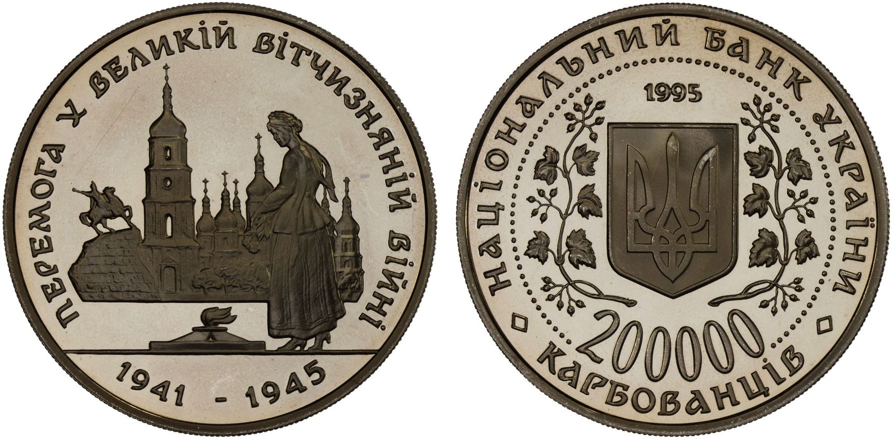 UKRAINE: Republic, 200,000 karbovantsiv, 1995, KM-10.1, 50th Anniversary of Victory in the Great Patriotic War, stuck at the Moscow mint, Russia, scarce variety with Ukrainian letter "Y" looks similar to "X", Proof