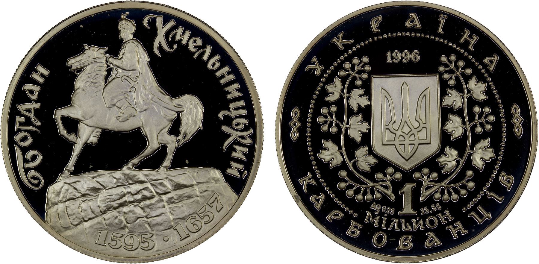 UKRAINE: Republic, AR 1,000,000 karbovantsiv, 1996, KM-16, Outstanding Personalities of Ukraine Series - Bohdan Khmelnytsky, struck at the Moscow mint, Russia with COA of issue, Proof. Commemorating the 400th anniversary of Bohdan Khmelnytsky - the Hetman of Ukraine, outstanding statesman, political and military figure of 17th century, who made significant contribution to the formation of Ukrainian statehood at one of the most dramatic periods of the liberation war of Ukrainian people in 1648-1654.