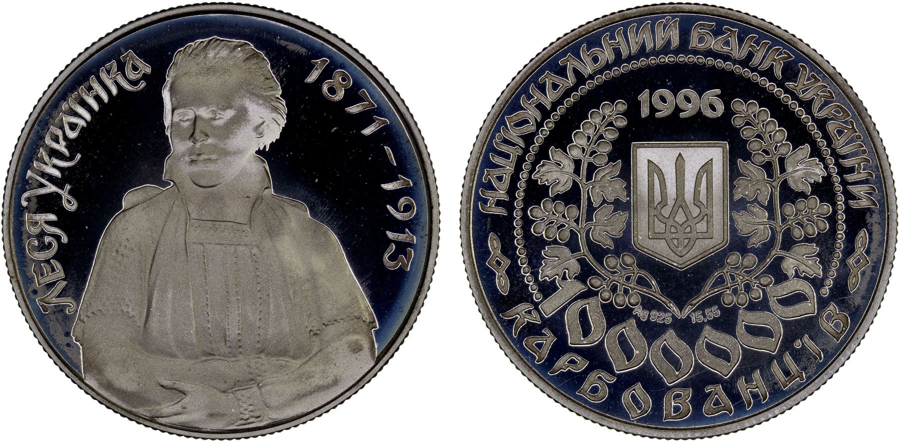 UKRAINE: Republic, AR 1,000,000 karbovantsiv, 1996, KM-18, Outstanding Personalities of Ukraine Series - Lesya Ukrayinka, variety with long hyphen between dates, struck at the Kremnica mint, Slovakia, Proof. The coin is dedicated to 125th anniversary of Lesya Ukrainka (Larysa Petrivna Kosach) - the outstanding Ukrainian poetess and public figure.