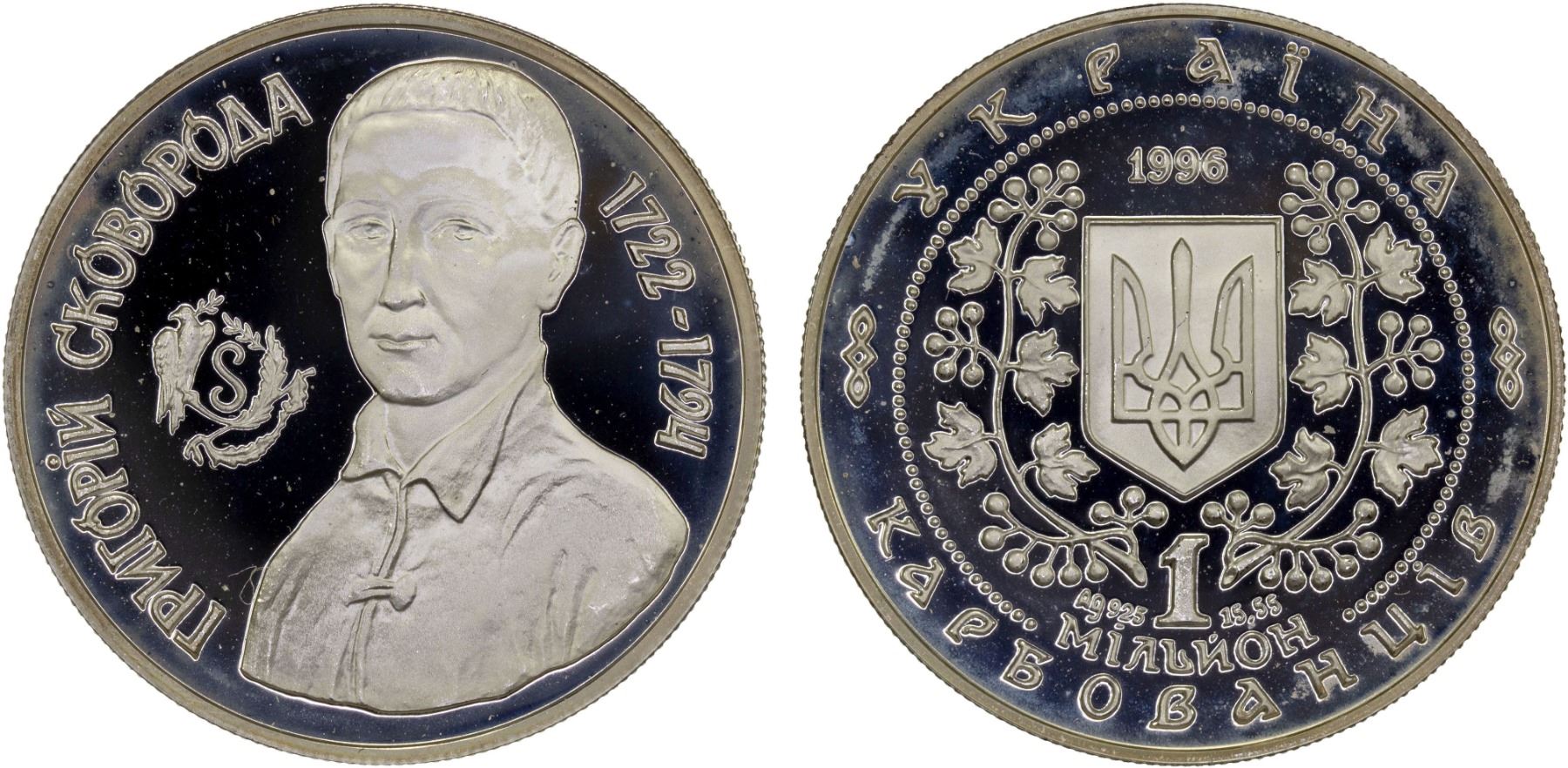 UKRAINE: Republic, AR 1,000,000 karbovantsiv, 1996, KM-20, Outstanding Personalities of Ukraine Series - Hrygoriy Skovoroda, struck at the Moscow mint, Russia, Proof. The coin is dedicated to Hryhoriy Skovoroda (1722-1794), a great Ukrainian philosopher and scientist of the 18th century.