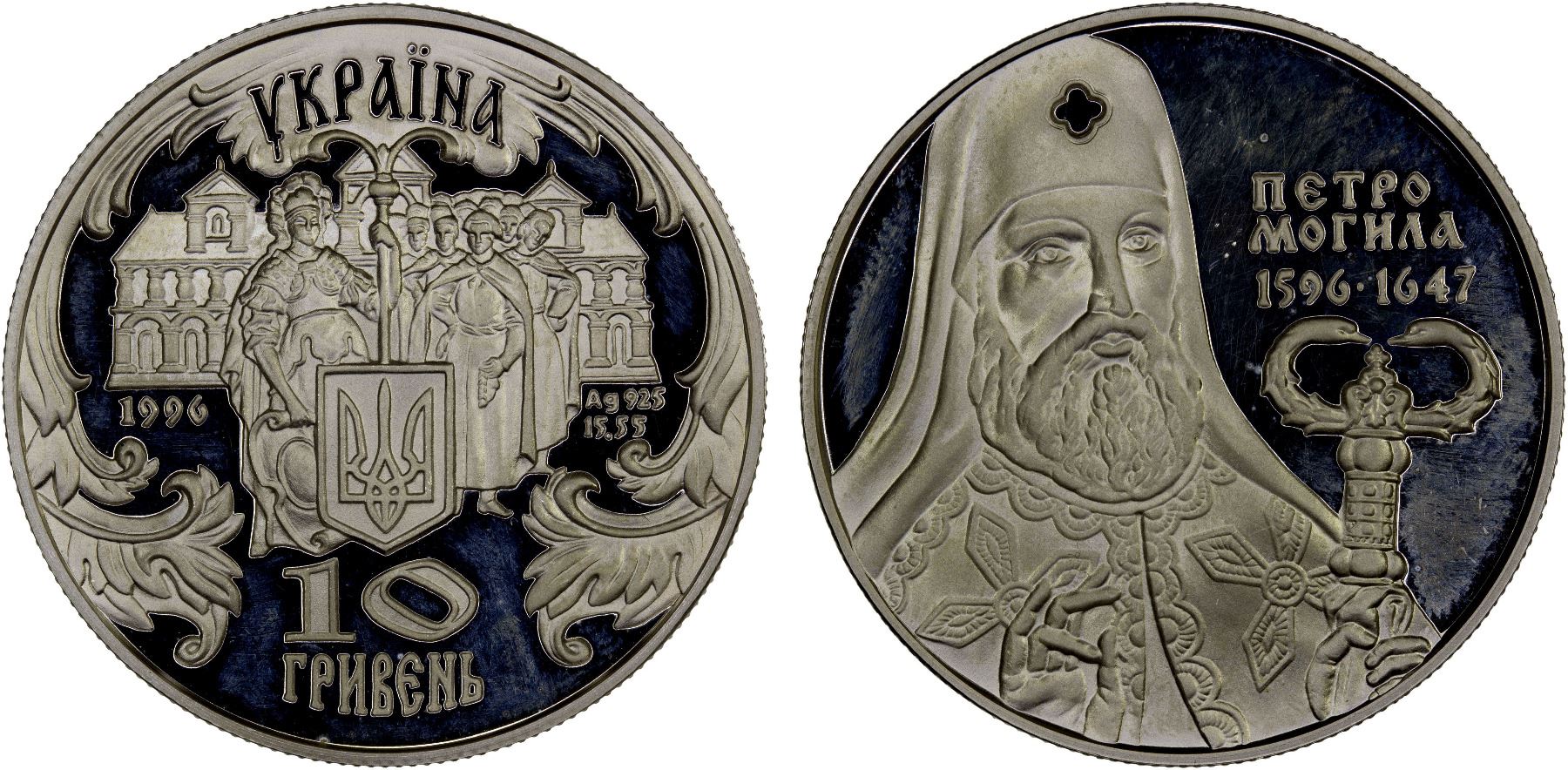 UKRAINE: Republic, AR 10 hryven, 1996, KM-34, Outstanding Personalities of Ukraine Series - 400th Anniversary of Birth of Petro Mohyla, struck at the Kremnica mint, Slovakia, Proof. The coin is dedicated to 400th anniversary of Petro Mohyla (1596-1647), an outstanding Ukrainian ecclesiastical, cultural, educational and political figure of the first half of the 17th century, the Metropolitan of Kyiv and Halych, one of the founders of the first higher school in Ukraine and Eastern Europe - the Kyiv-Mohyla Collegium.