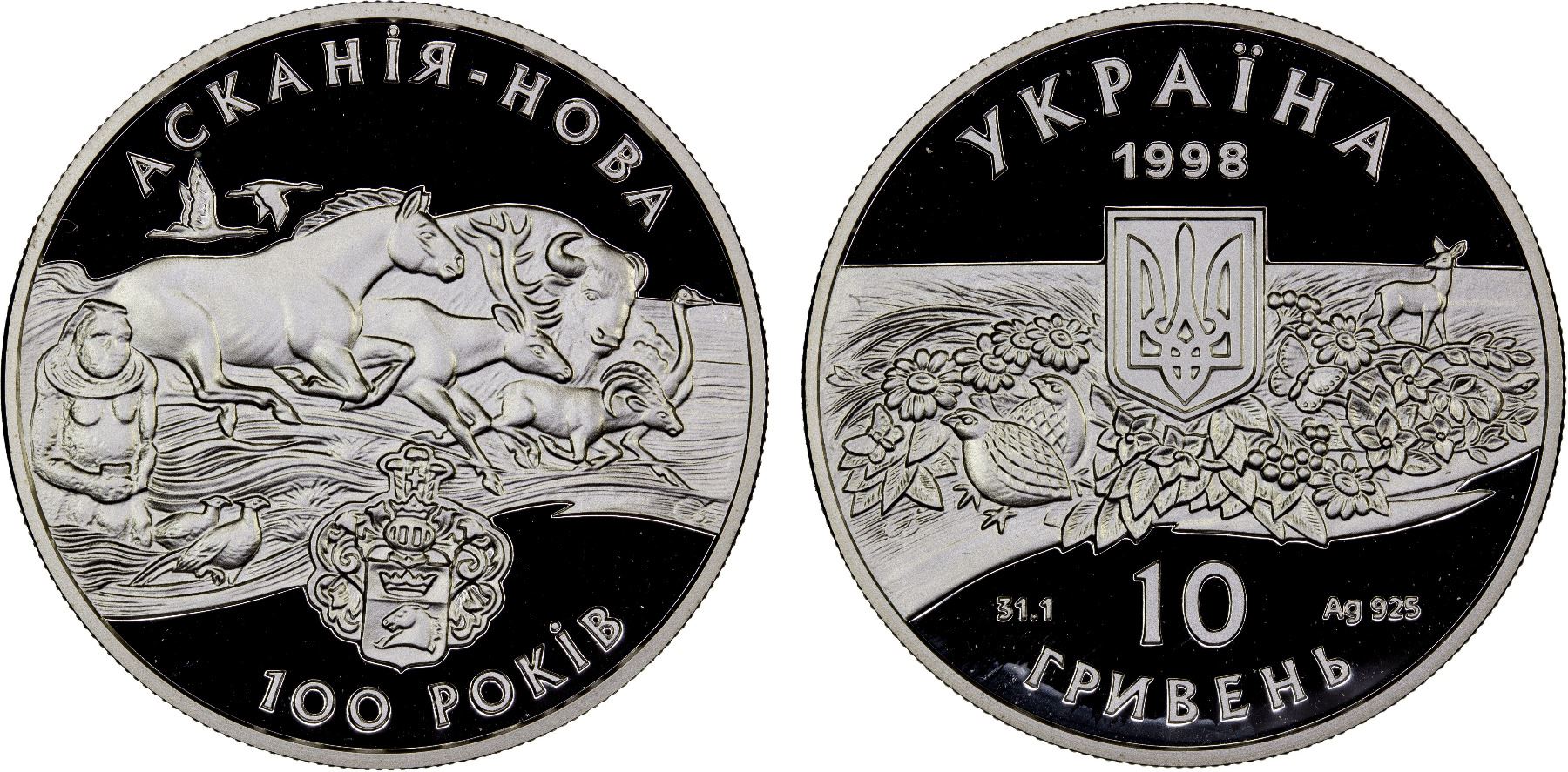 UKRAINE: Republic, AR 10 hryven, 1998, KM-50, Flora and Fauna of Ukraine Series - Askania-Nova Nature Reserve, struck at Ukrainian mint, Kyiv with COA of issue, Proof. The nature reserve was established in 1898 by Friedrich-Jacob Eduardovych Falz-Fein (1863–1920) around the German colony of Askania-Nova. In March 1919, Askania-Nova was confiscated from the Falz-Fein family by the Red Army as part of the state nationalization program. On April 1, 1919, Askania-Nova was declared a People's Sanctuary Park by a decree of the Council of People's Commissars of the Ukrainian SSR; while on February 8, 1921, it was reorganized into a State Steppe Reserve of the Ukrainian SSR.