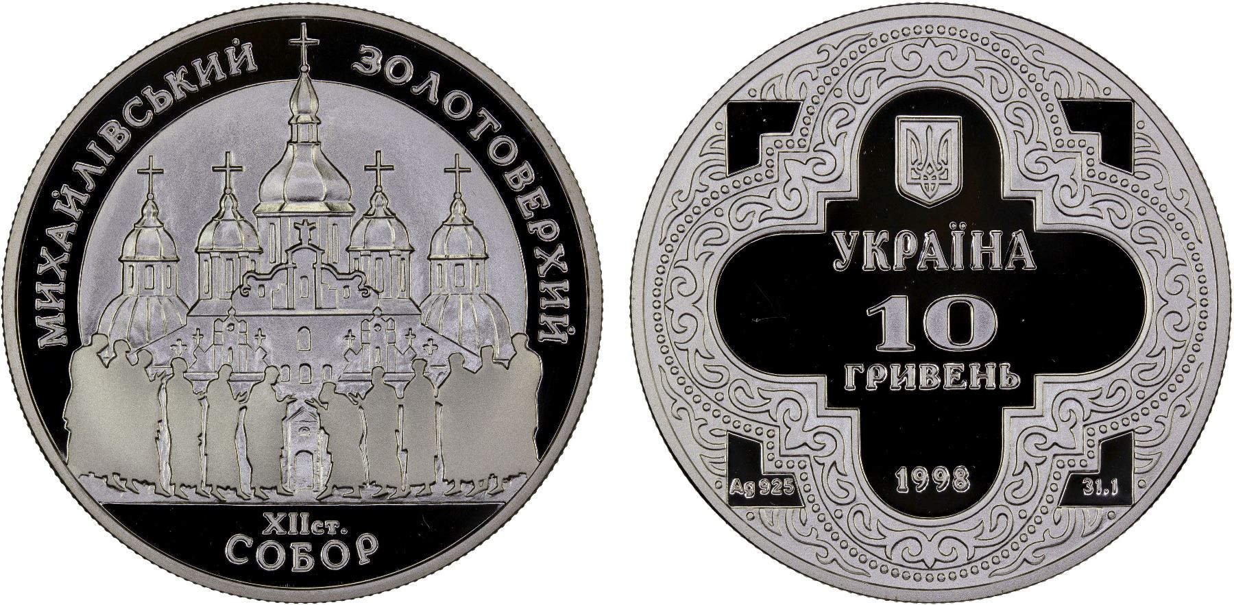 UKRAINE: Republic, AR 10 hryven, 1998, KM-67, Spiritual Treasures of Ukraine Series - St. Michael's Golden-Domed Cathedral, struck at Ukrainian mint, Kyiv with COA of issue, Proof. The commemorative coin is dedicated to the restoration of St. Michael's Golden-Domed Cathedral, a historical and architectural monument of the Kievan Rus' period.