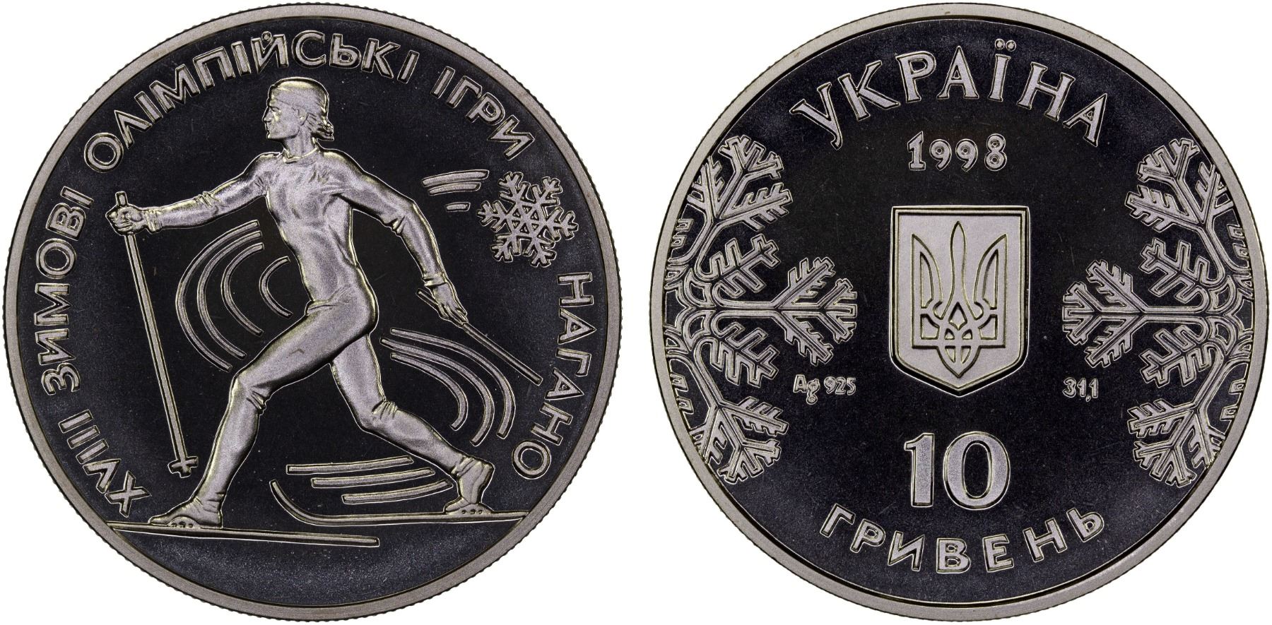 UKRAINE: Republic, AR 10 hryven, 1998, KM-44, Nagano Winter Olympic Games - Cross Country Skiing, struck at Ukrainian mint, Kyiv with COA of issue, Proof.