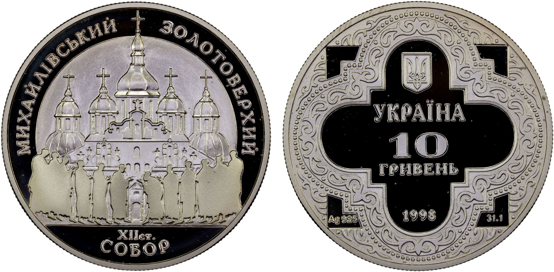 UKRAINE: Republic, AR 10 hryven, 1998, KM-67, Spiritual Treasures of Ukraine Series - St. Michael's Golden-Domed Cathedral, struck at Ukrainian mint, Kyiv with COA of issue, Proof. The commemorative coin is dedicated to the restoration of St. Michael's Golden-Domed Cathedral, a historical and architectural monument of the Kievan Rus' period.