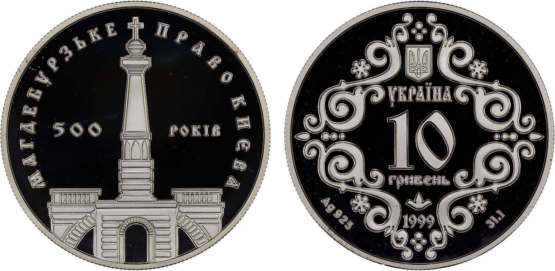 UKRAINE: Republic, AR 10 hryven, 1999, KM-87, Spiritual Treasures of Ukraine Series - 500th Anniversary of Kyiv's Magdeburg Law, struck at the Uranian mint, Kyiv, Proof.