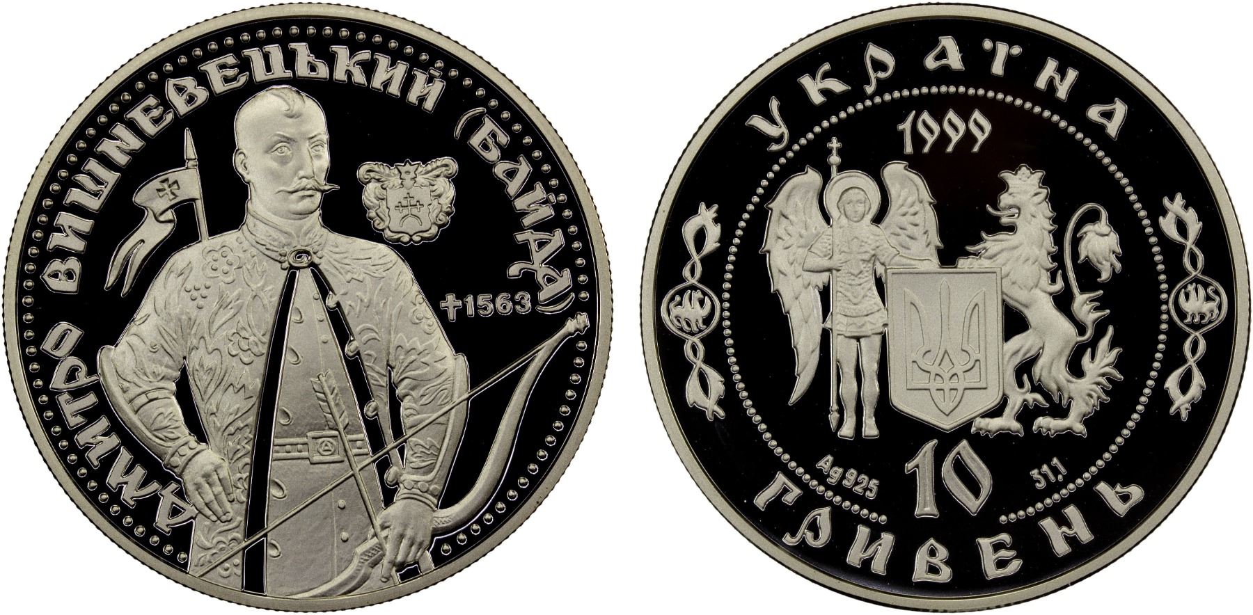 UKRAINE: Republic, AR 10 hryven, 1999, KM-77, Heroes of Cossack Age Series - Dmytro Vyshnevetsky, struck at the Ukrainian mint, Kyiv, with COA of issue, Proof. The commemorative coin is dedicated to Dmytro Vyshnevetsky, the orthodox Prince and Cossack ataman, who in 1556 built a fortress on the Dnipro River island of Mala Khortytsia and founded the Zaporizhian Sich.