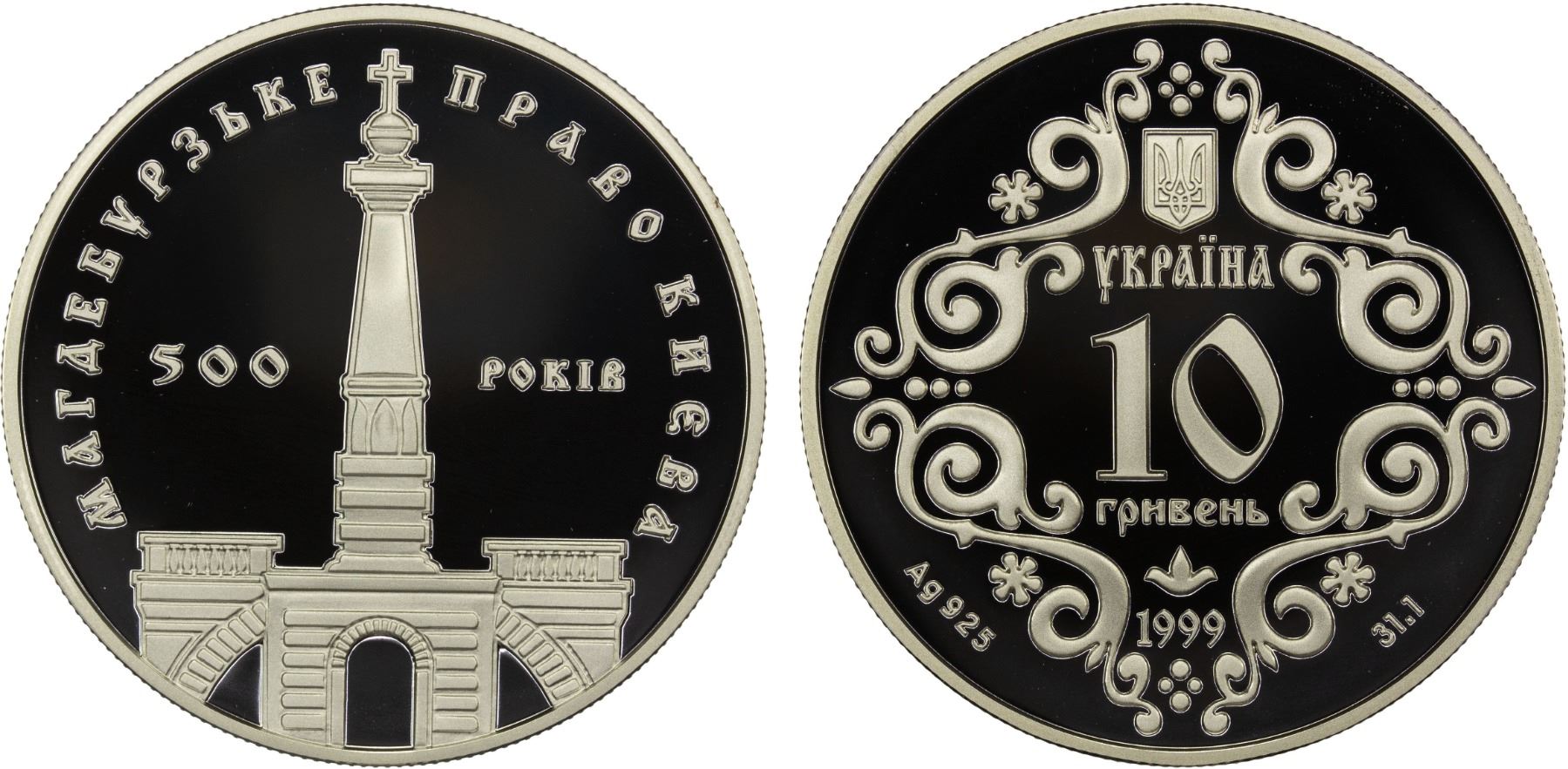 UKRAINE: Republic, AR 10 hryven, 1999, KM-87, Spiritual Treasures of Ukraine Series - 500th Anniversary of Kyiv's Magdeburg Law, struck at the Ukrainian mint, Kyiv with COA of issue, Proof.