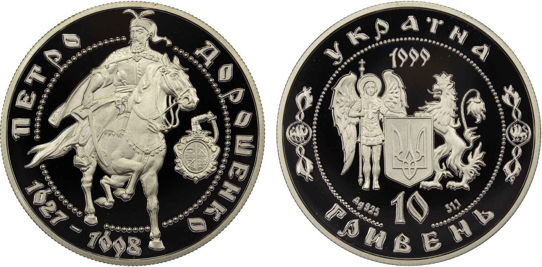 UKRAINE: Republic, AR 10 hryven, 1999, KM-88, Heroes of Cossack Age Series - Petro Doroshenko, struck at the Ukrainian mint, Kyiv, Proof. Petro Dorofiiovych Doroshenko (1627-1698) was a Cossack political and military leader, Hetman of right-bank Ukraine (1665-1672) and a Russian voivode or military leader.