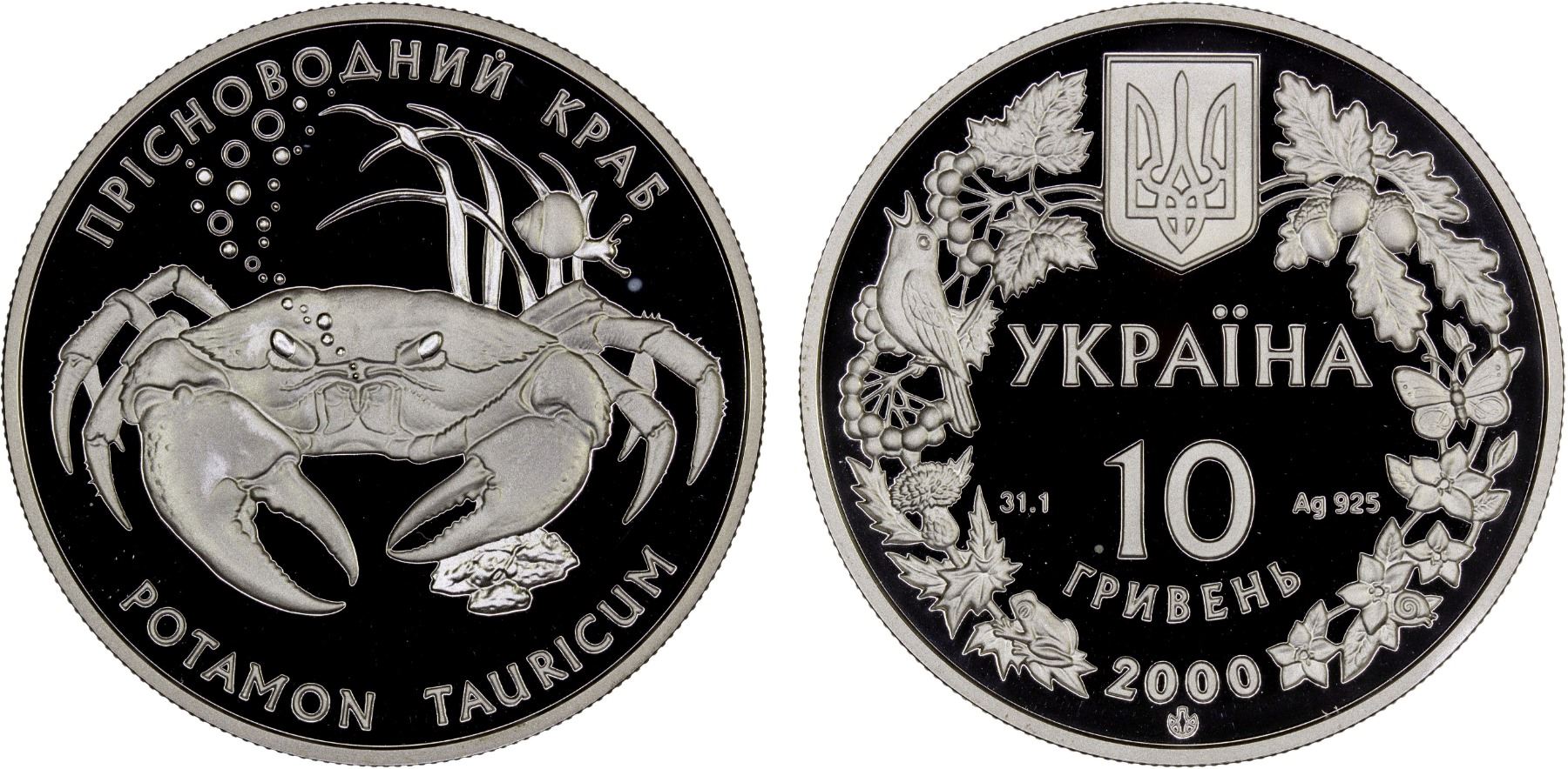 UKRAINE: Republic, AR 10 hryven, 2000, KM-121, Flora and Fauna Series – Freshwater Crab, struck at the Ukrainian mint, Kyiv, Proof.