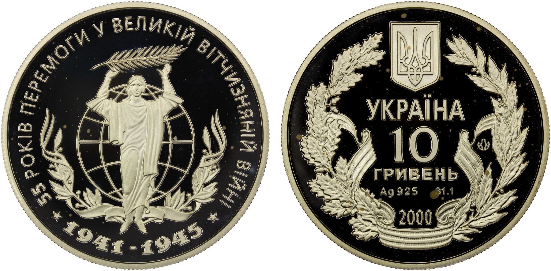 UKRAINE: Republic, AR 10 hryven, 2000, KM-108, 55th Anniversary of Victory in the Second World War, struck at the Ukrainian mint, Kyiv, Proof.