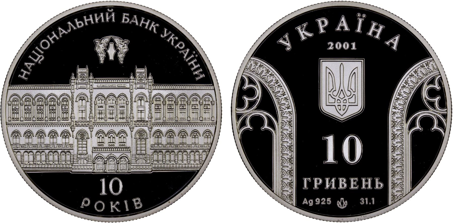 UKRAINE: Republic, AR 10 hryven, 2001, KM-130, 10th Anniversary of the National Bank of Ukraine, struck at the Ukrainian mint, Kyiv, with COA of issue, Proof.