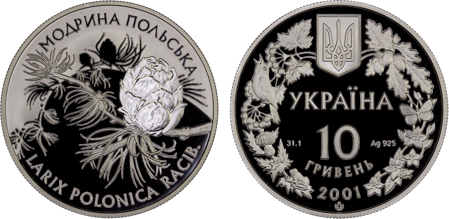 UKRAINE: Republic, AR 10 hryven, 2001, KM-141, Flora and Fauna Series– Polish larch (Larix Polonica), struck at the Ukrainian mint, Kyiv, with COA of issue, Proof.