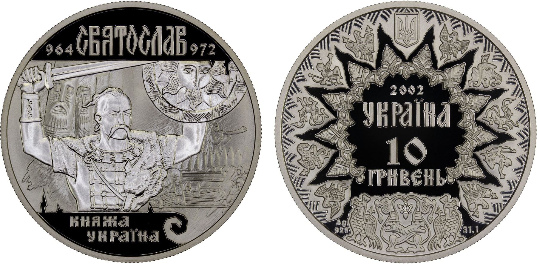 UKRAINE: Republic, AR 10 hryven, 2002, KM-162, Princes of Ukraine Series – Svyatoslav I Igorevich, struck at the Ukrainian mint, Kyiv, with COA of issue, Proof.