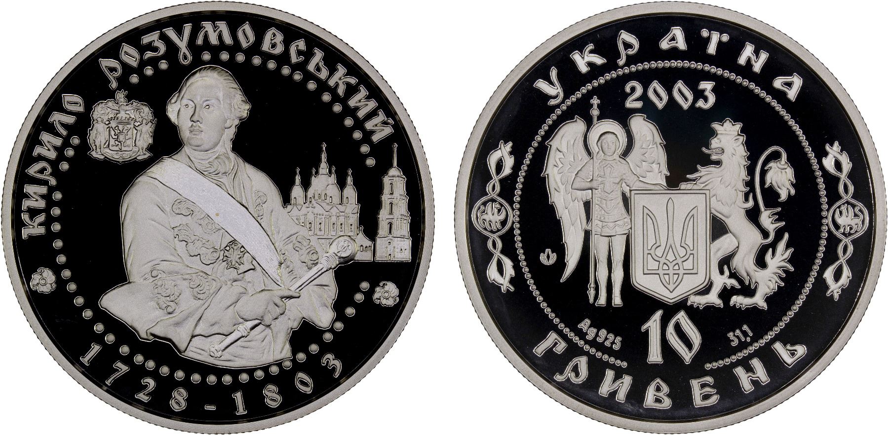 UKRAINE: Republic, AR 10 hryven, 2003, KM-195, Heroes of Cossack Age Series – Kyrylo Rozumovskyi, struck at the Ukrainian mint, Kyiv, with COA of issue, Proof.