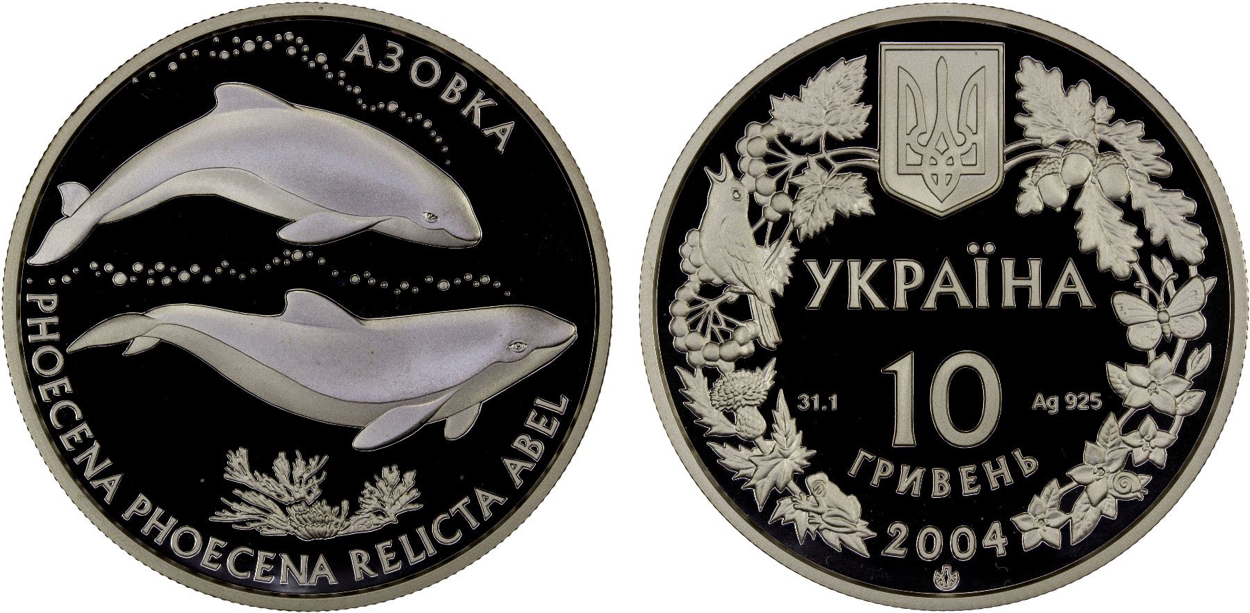 UKRAINE: Republic, AR 10 hryven, 2004, KM-206, Flora and Fauna Series – Azov Dolphin (Phoecena phoecena relicta abel), struck at the Ukrainian mint, Kyiv, with COA of issue, Proof.