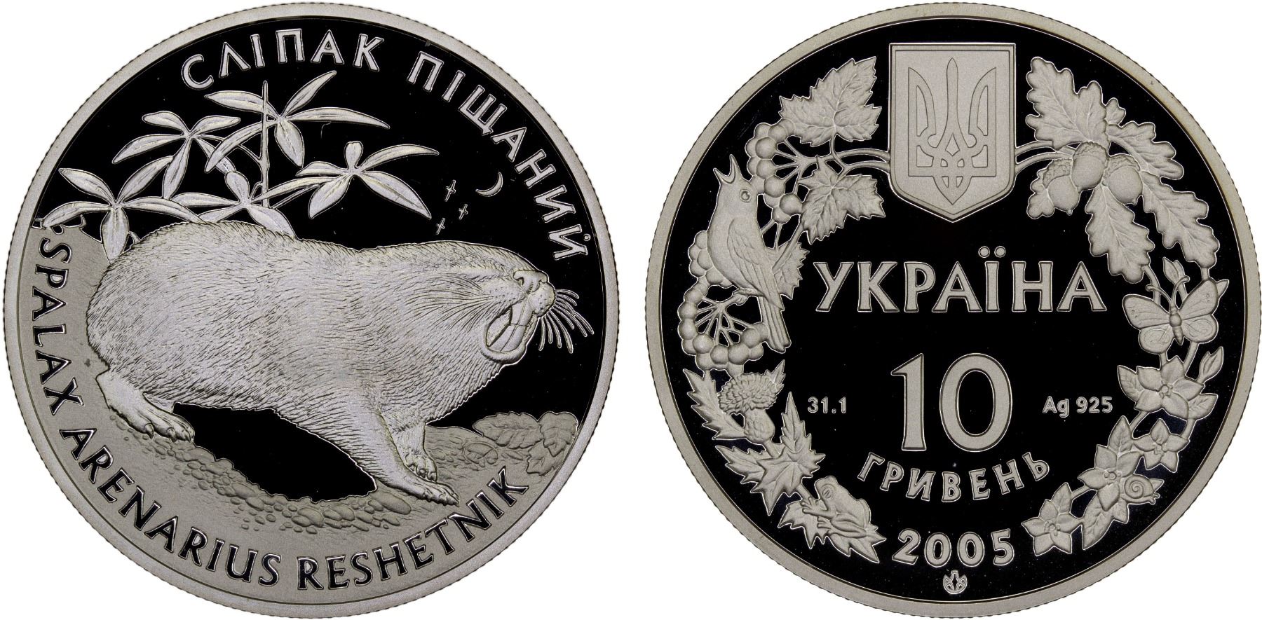 UKRAINE: Republic, AR 10 hryven, 2005, KM-358, Flora and Fauna Series – Sandy Mole Rat (Spalax arenarius reshetnik), struck at the Ukrainian mint, Kyiv, with COA of issue, Proof.
