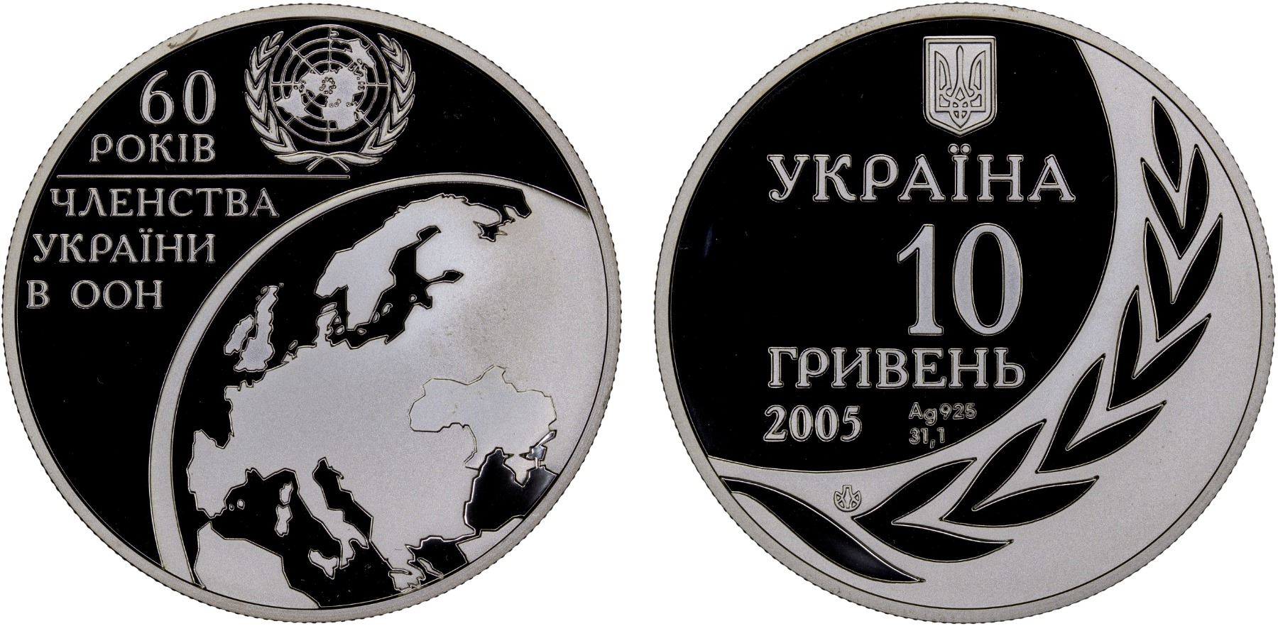 UKRAINE: Republic, AR 10 hryven, 2005, KM-370, 60th Anniversary of Ukraine Membership in the United Nations, struck at the Ukrainian mint, Kyiv, with COA of issue, Proof.