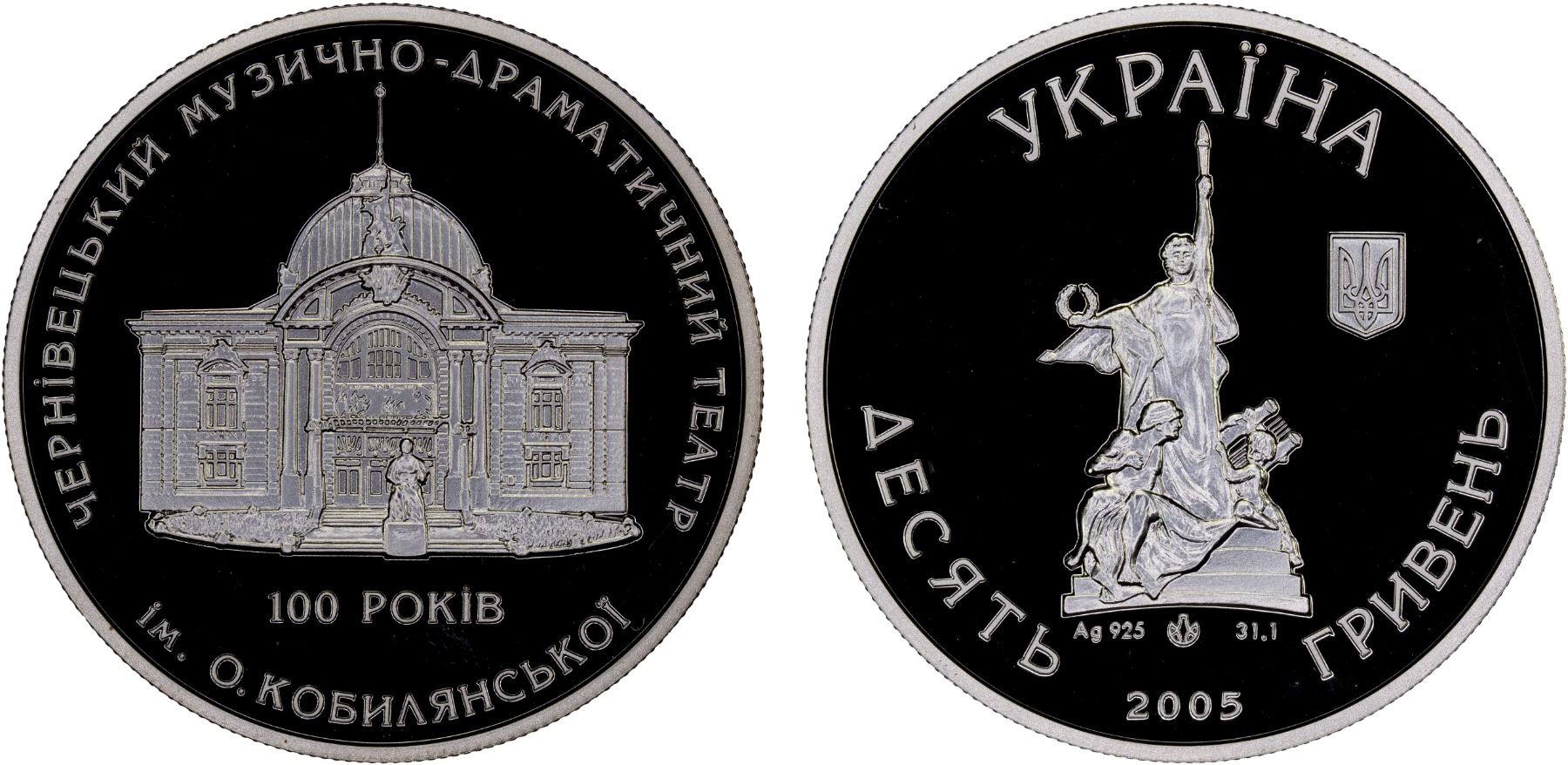 UKRAINE: Republic, AR 10 hryven, 2005, KM-372, Centenary of Olha Kobylianska Music and Drama Theatre in Chernivtsi, struck at the Ukrainian mint, Kyiv, with COA of issue, Proof.
