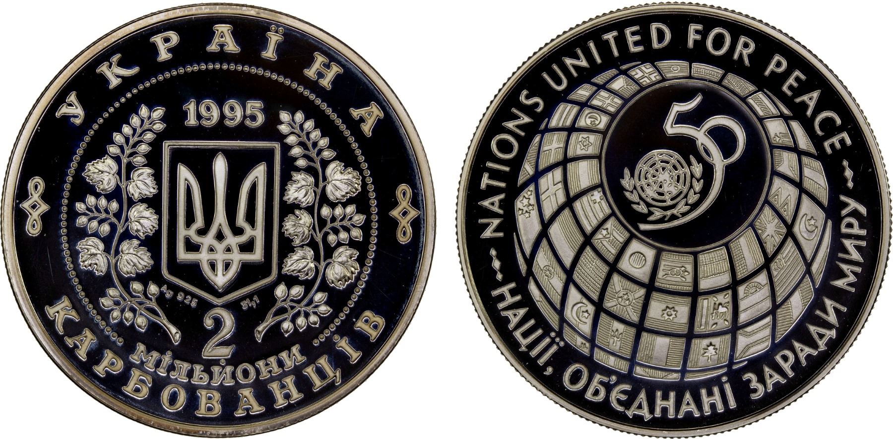 UKRAINE: Republic, AR 2,000,000 karbovantsiv, 1995, KM-19, 50th Anniversary of the United Nations, struck at the British Royal Mint, Proof.