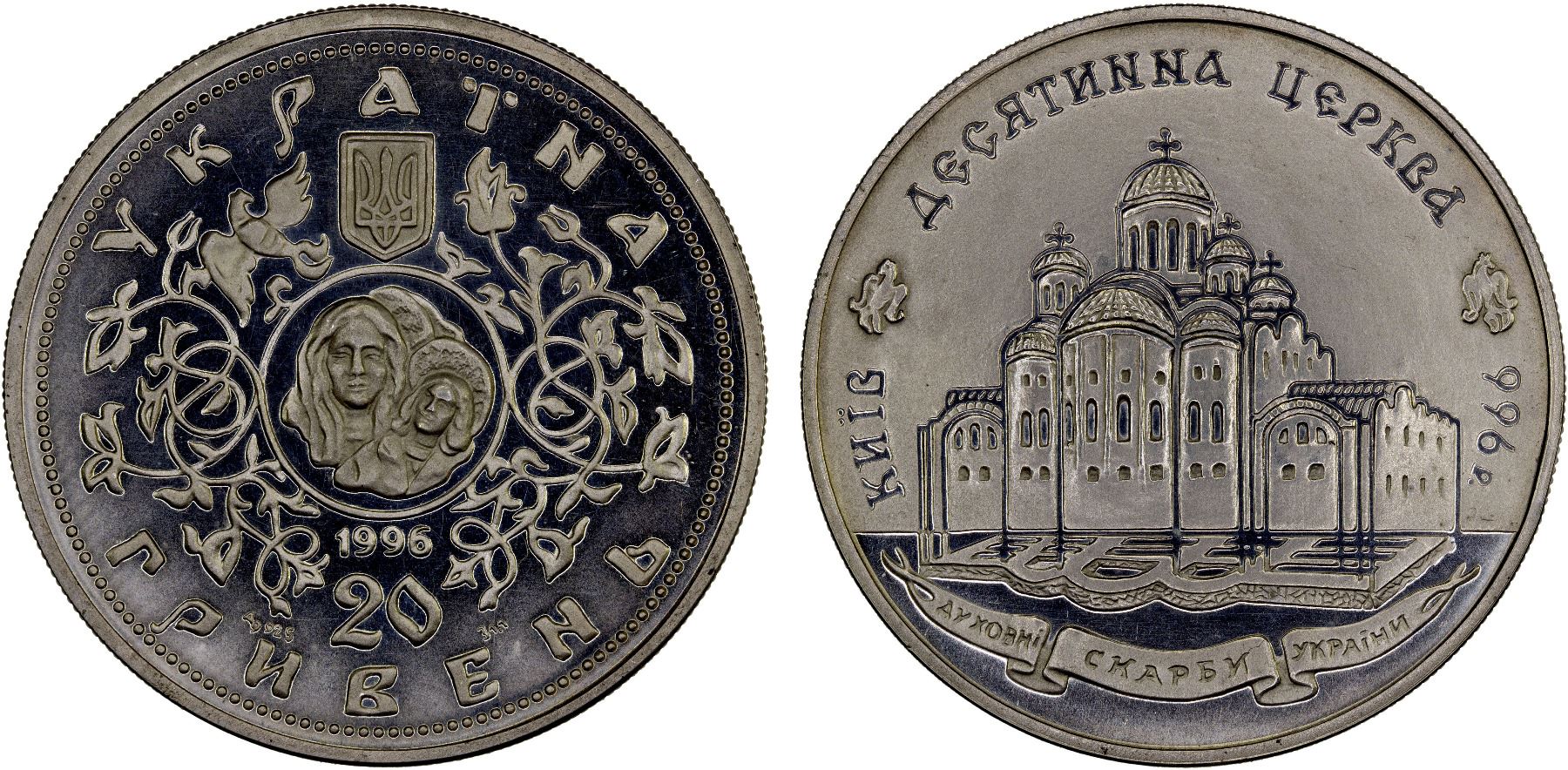 UKRAINE: Republic, AR 20 hryven, 1996, KM-35, Spiritual Treasures of Ukraine Series - 1000th anniversary of the Tithe Church, struck at the Kremnica mint, Slovakia, Proof. Commemorative coin is dedicated to 1000th anniversary of the founding of the Tithe Church in Kiyv, the first stone church in Kievan Rus.