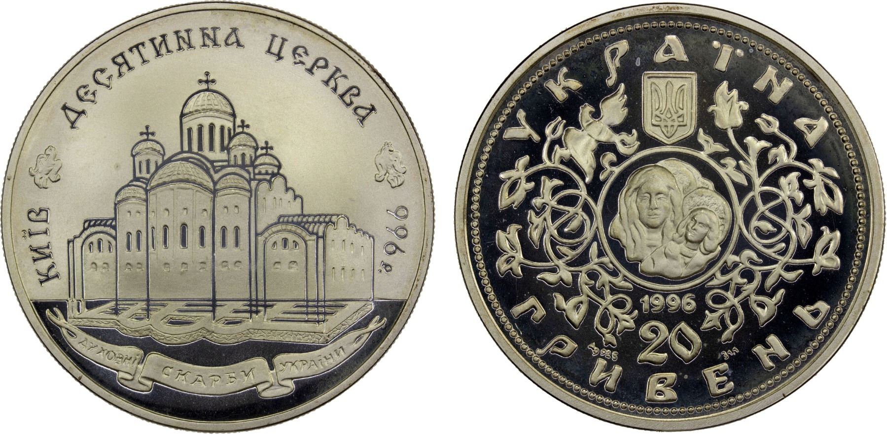 UKRAINE: Republic, AR 20 hryven, 1996, KM-35, Spiritual Treasures of Ukraine Series - 1000th Anniversary of the Tithe Church, struck at the Kremnica mint, Slovakia, Proof. This commemorative coin is dedicated to the 1000th anniversary of the founding of the Tithe Church in Kyiv, the first stone church in Kievan Rus.