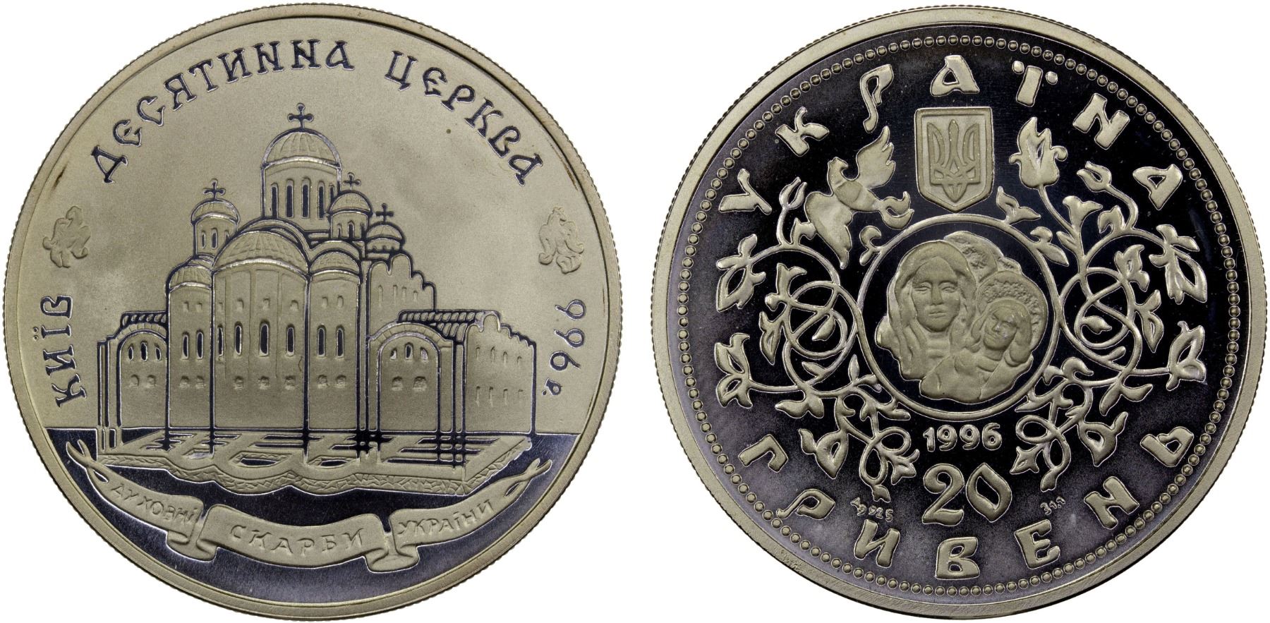 UKRAINE: Republic, AR 20 hryven, 1996, KM-35, Spiritual Treasures of Ukraine Series - 1000th Anniversary of the Tithe Church, struck at the Kremnica mint, Slovakia, Proof. This commemorative coin is dedicated to the 1000th anniversary of the founding of the Tithe Church in Kyiv, the first stone church in Kievan Rus.