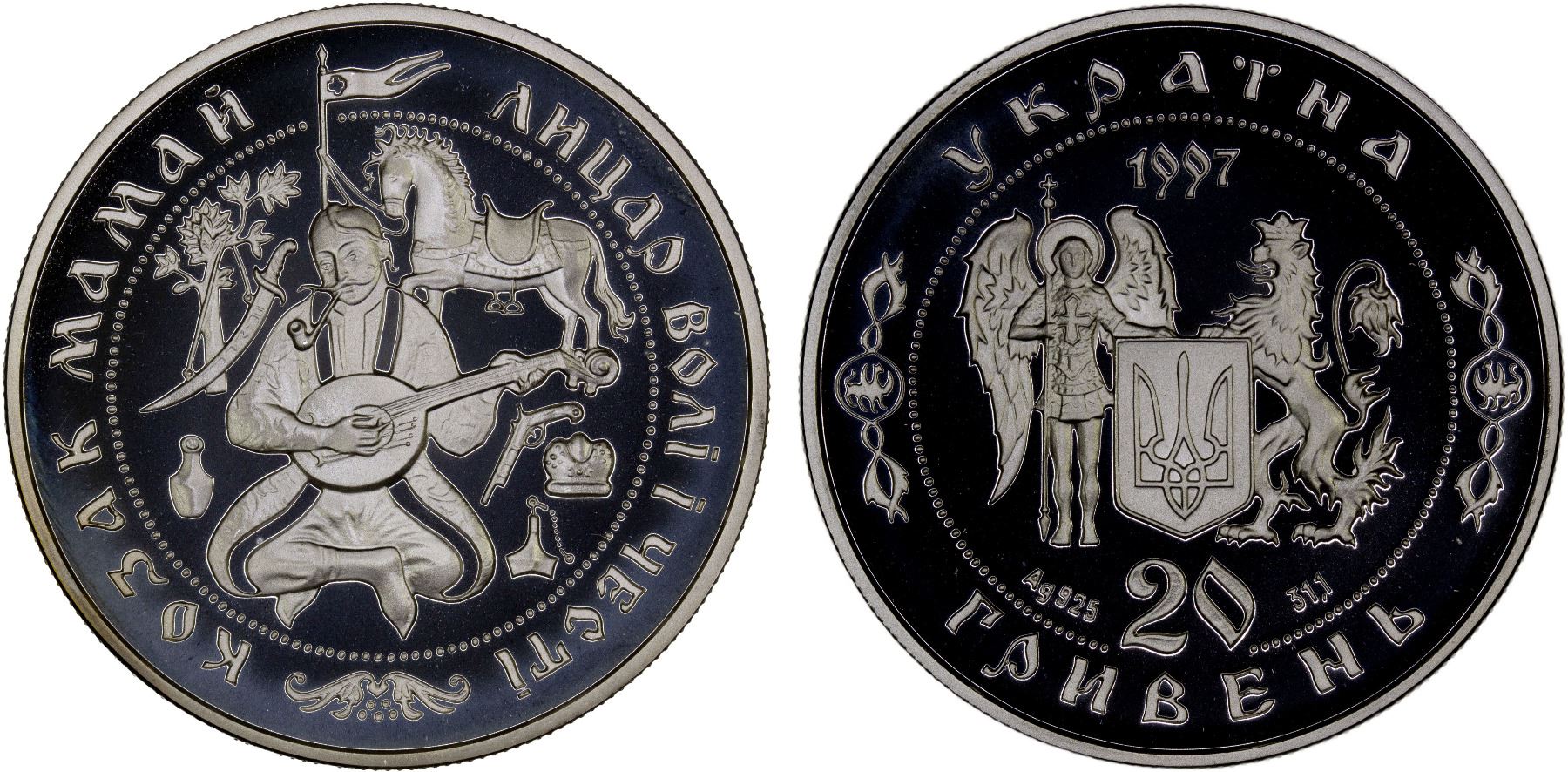 UKRAINE: Republic, AR 20 hryven, 1997, KM-54, Heroes of Cossack Age Series - Cossack Mamay, with COA of issue, Proof. The coin is the first one from the Heroes of Cossack Age series, presenting a gallery of characters of glorious sons of Ukraine and most important events in the country's history of 16th-18th centuries. Cossack Mamay is one of the most widespread folklore heroes in Ukraine. He is encountered in legends, folk stories and proverbs. These became widely popular after the dissolution of the Zaporozhian Sich in 1775.