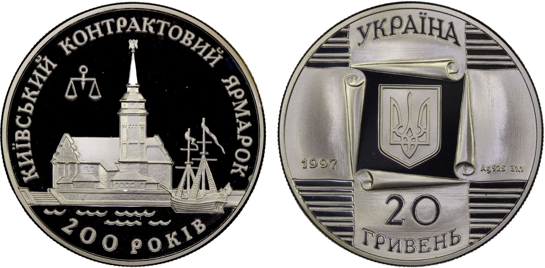UKRAINE: Republic, AR 20 hryven, 1997, KM-57, 200th Anniversary of the Opening the Kyiv Contract Fair, Proof. The transfer of the important annual contract fair from Dubno to Kyiv, a decision made by Tsar Paul I, was made to stimulate Kyiv's economy. The fair, which became known as the Kyiv Contract Fair, began operating in Kyiv in 1797 and was closed in 1927 after being banned by the Soviet authorities. The fair had changed from a contract and wholesale market into a simple commercial fair and lost much of its importance after the 1917 October Revolution. Its closure was part of the Soviet government's anti-private ownership policies.