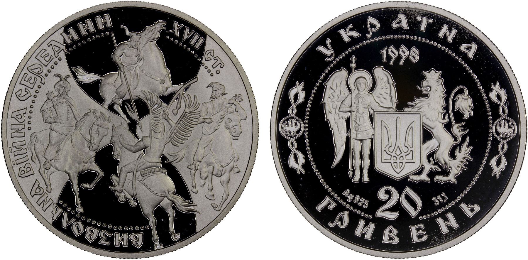 UKRAINE: Republic, AR 20 hryven, 1998, KM-58, Heroes of Cossack Age - 17th Century Cossack Uprising, struck at Ukrainian mint, Kyiv, Proof. This type portrays a depiction of a fight of Zaporizhzhya Cossack and a Polish winged Reitar. Aside of the battle scene there are rider figures: Hetman Bohdan Khmelnitsky, leader of the liberation movement and a Bandura-Cossack, bard of heroic campaigns.