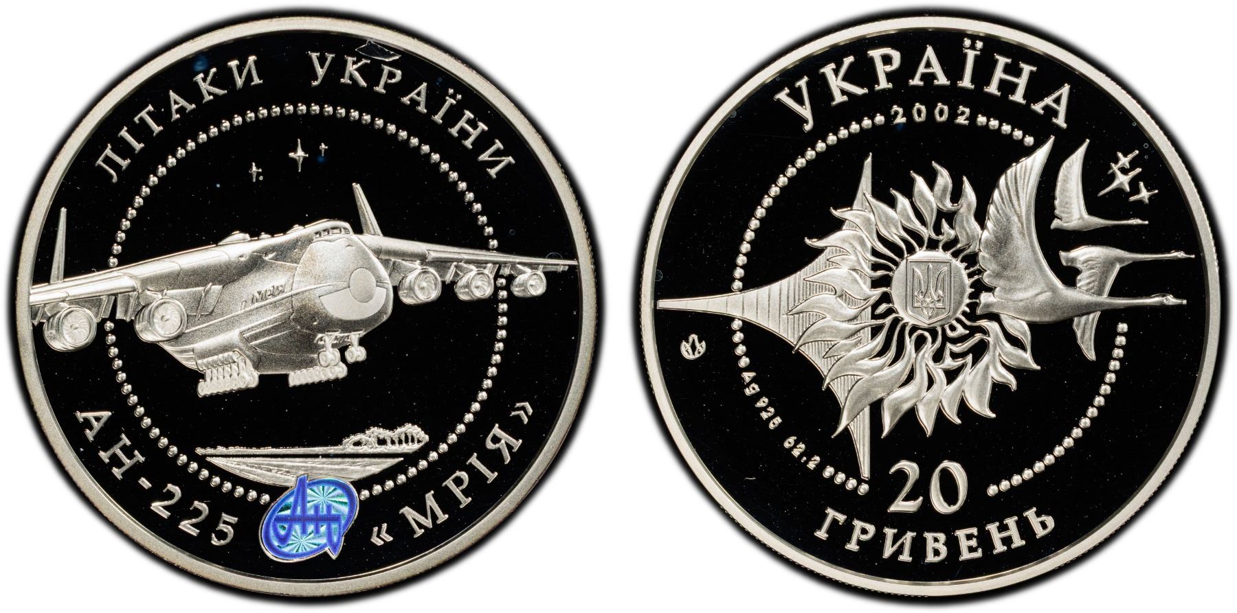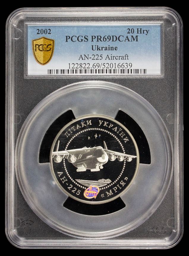 UKRAINE: Republic, AR 20 hryven, 2002, KM-153, Zahreba-CM.20.8, Airplanes of Ukraine Series - AN-225 'Mria' Aircraft, contains 2 troy ounces of pure silver, struck the Ukrainian Mint, Kyiv, PCGS graded PF69 Deep Cameo. The Antonov An-225, the world's largest cargo plane known as "Mriya" (The Dream), was destroyed by Russian forces during the 2022 Battle of Antonov Airport in Ukraine, on or about February 27, 2022. The unique aircraft was damaged by Russian missiles while it was undergoing maintenance at the Hostomel airport, a key target in the early stages of the invasion. The destruction of the Ukrainian symbol was confirmed by Ukrainian officials and was seen as a symbolic loss, though the dream of rebuilding the plane to support a strong, free Ukraine was immediately expressed.