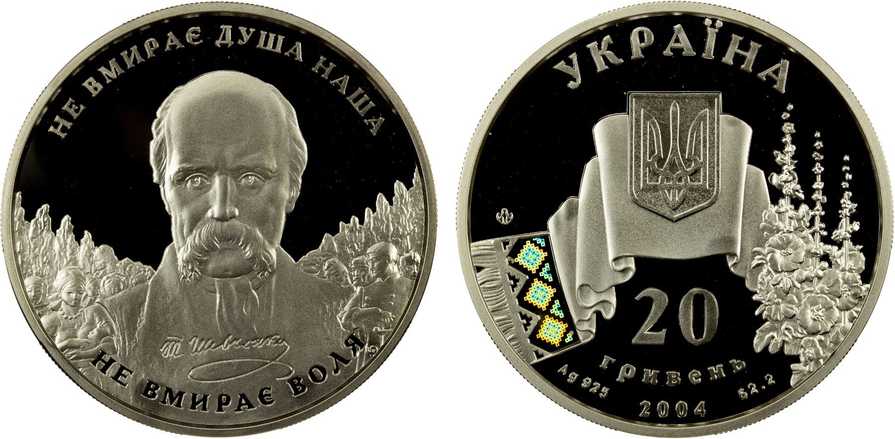 UKRAINE: Republic, AR 20 hryven, 2004, KM-226, Spiritual Treasures of Ukraine Series - 190th Anniversary of the Birth of Taras Shevchenko, struck at the Ukrainian mint, Kyiv, with COA of issue, contains two troy ounces of pure silver, Proof. Taras Hryhorovych Shevchenko[a] (1814-1861) was a Ukrainian poet, writer, artist, public and political figure, folklorist, and ethnographer. His literary heritage, in particular the poetry collection Kobzar, is regarded to be the foundation of modern Ukrainian literature and to some degree also of the modern Ukrainian language.