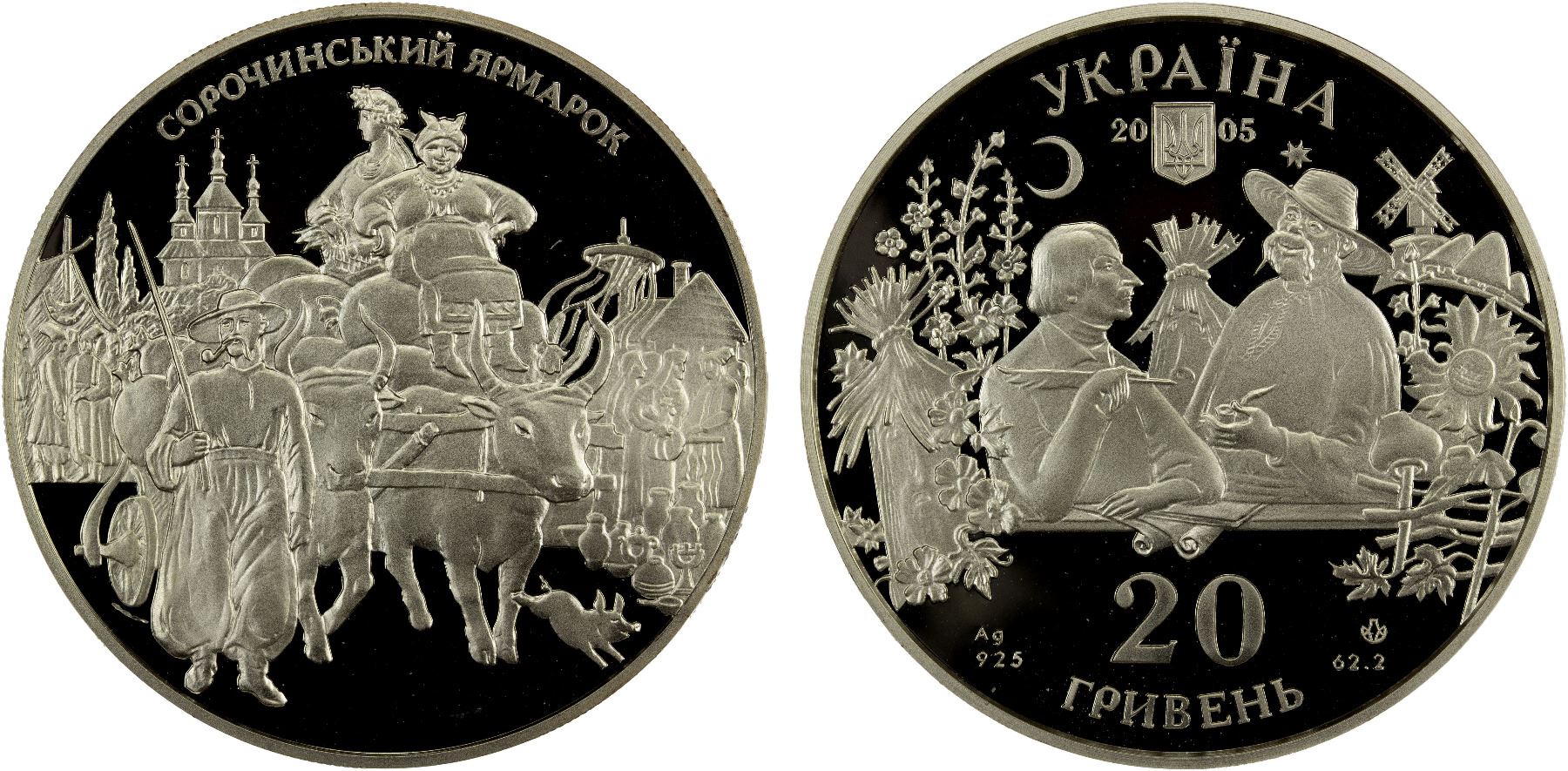 UKRAINE: Republic, AR 20 hryven, 2005, KM-369, Ukrainian Heritage Series - Sorochynsky Fair, struck at the Ukrainian mint, Kyiv, with COA of issue, contains two troy ounces of pure silver, Proof. "Sorotchintzy Fair" is a short story by Nikolai Gogol, the first in his collection Evenings on a Farm Near Dikanka, blending Ukrainian folklore, romance, and comedy around a bustling country fair. The plot follows a young man, Grytsko, who falls for a beautiful girl, Paraska, at the fair, but faces obstacles from her mean stepmother, leading him to use local superstitions, including a tale about a demon's red jacket, to win her hand.