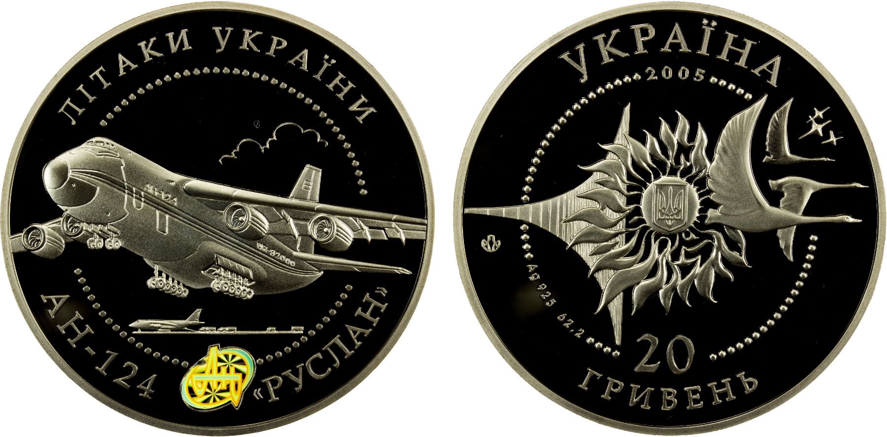 UKRAINE: Republic, AR 20 hryven, 2005, KM-363, Airplanes of Ukraine Series -'Ruslan' AN-124 Aircraft, struck at the Ukrainian mint, Kyiv, with COA of issue, contains two troy ounces of pure silver, Proof. The Antonov An-124 'Ruslan' is a large, strategic airlift, four-engine aircraft that was designed in the 1980s by the Antonov design bureau in the Ukrainian SSR of the Soviet Union (USSR).