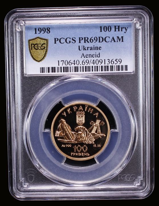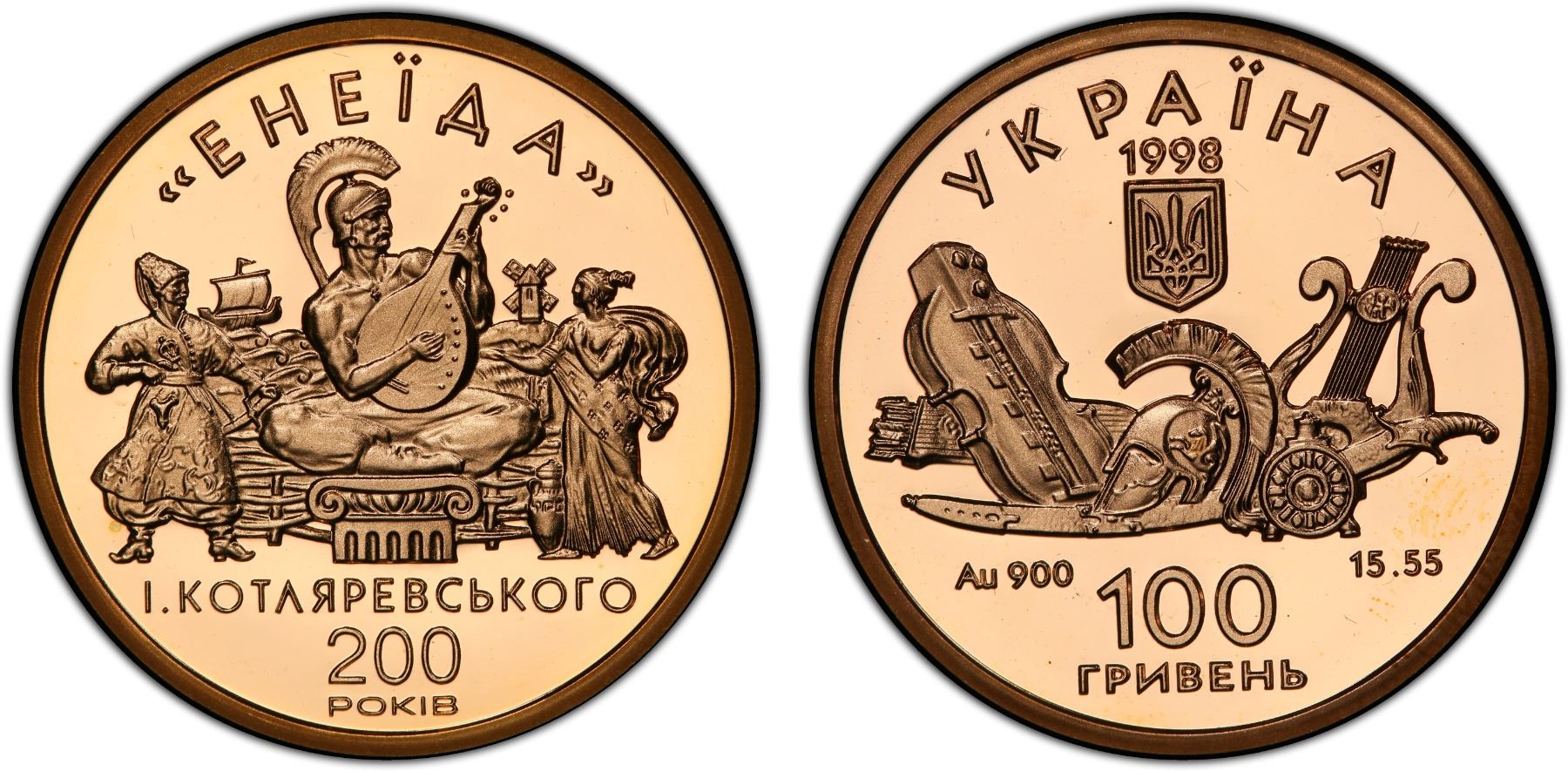 UKRAINE: Republic, AV 100 hryven, 1998, KM-65, Zahreba-3M.100.2, Spiritual Treasures of Ukraine Series - Aeneid, struck at the Ukrainian mint, Kyiv, PCGS graded PF69 Deep Cameo. The 'Aeneid' (Eneida) is a burlesque poem in the Ukrainian language, written by Ivan Kotliarevsky in 1798. This mock-heroic poem is considered to be the first literary work published wholly in the Ukrainian vernacular.