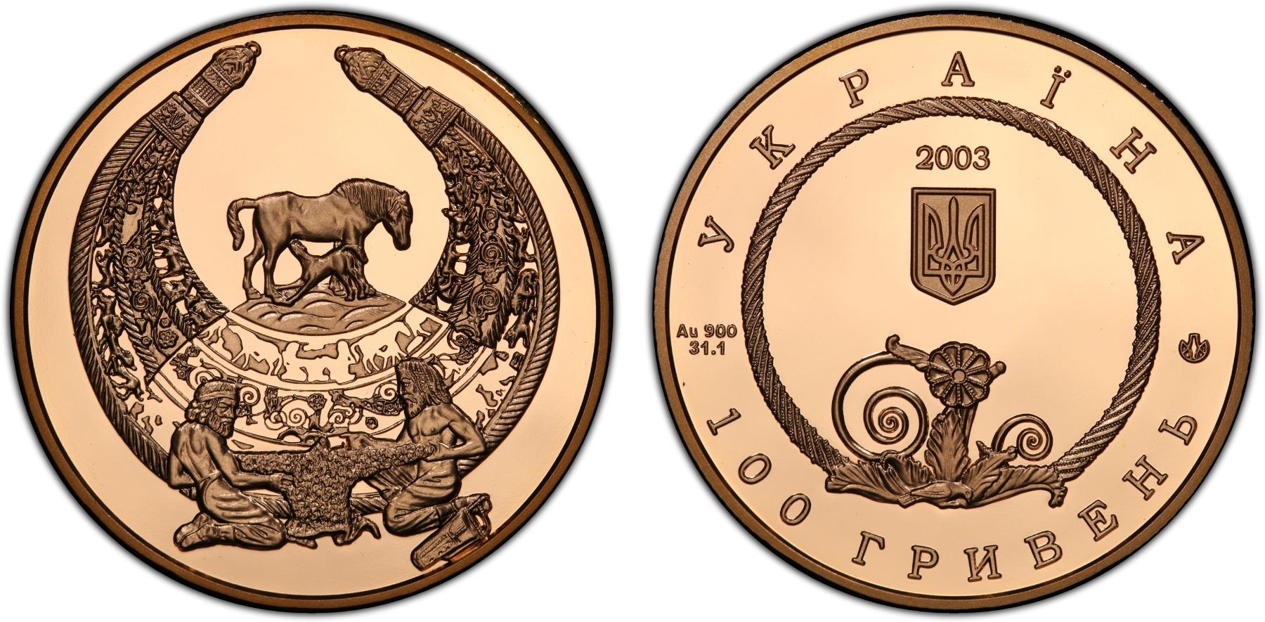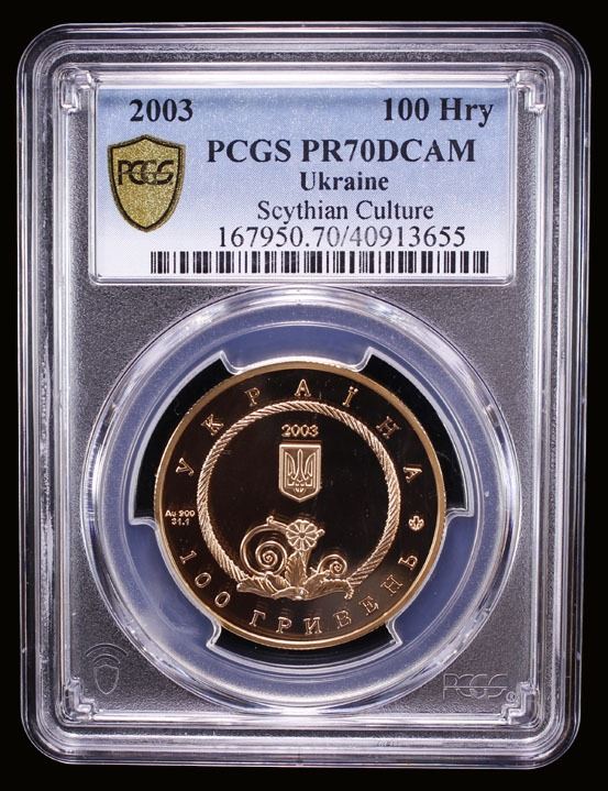 UKRAINE: Republic, AV 100 hryven, 2003, KM-199, Zahreba-3M.100.5, Spiritual Treasures of Ukraine Series - The Golden Pectoral, struck at the Ukrainian mint, Kyiv, PCGS graded PF69 Deep Cameo. The Golden Pectoral from Tovsta Mohyla is a gold Scythian collar or pectoral discovered in a burial kurgan at a site called Tovsta Mohyla in modern Dnipropetrovsk Oblast, Ukraine, in 1971 by the Ukrainian archaeologist Borys Mozolevskyi. The Tovsta Mohyla burial mound, meaning fat barrow, is in present-day southern Ukraine near the city of Pokrov. The Golden Pectoral is now in the Museum of Historical Treasures of Ukraine in Kyiv.