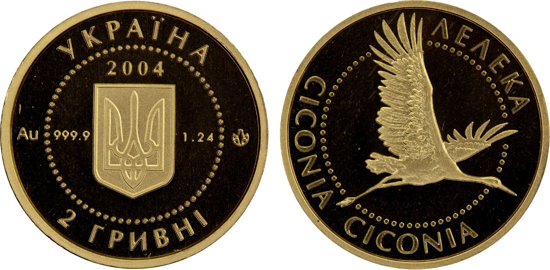 UKRAINE: Republic, AV 2 hryvni, 2004, KM-227, Zahreba-3M.2.2, The Smallest Golden Coin Series - Stork, struck at the Ukrainian mint, Kyiv, Proof. The white stork is one of two species of the stork family in the fauna of Ukraine.