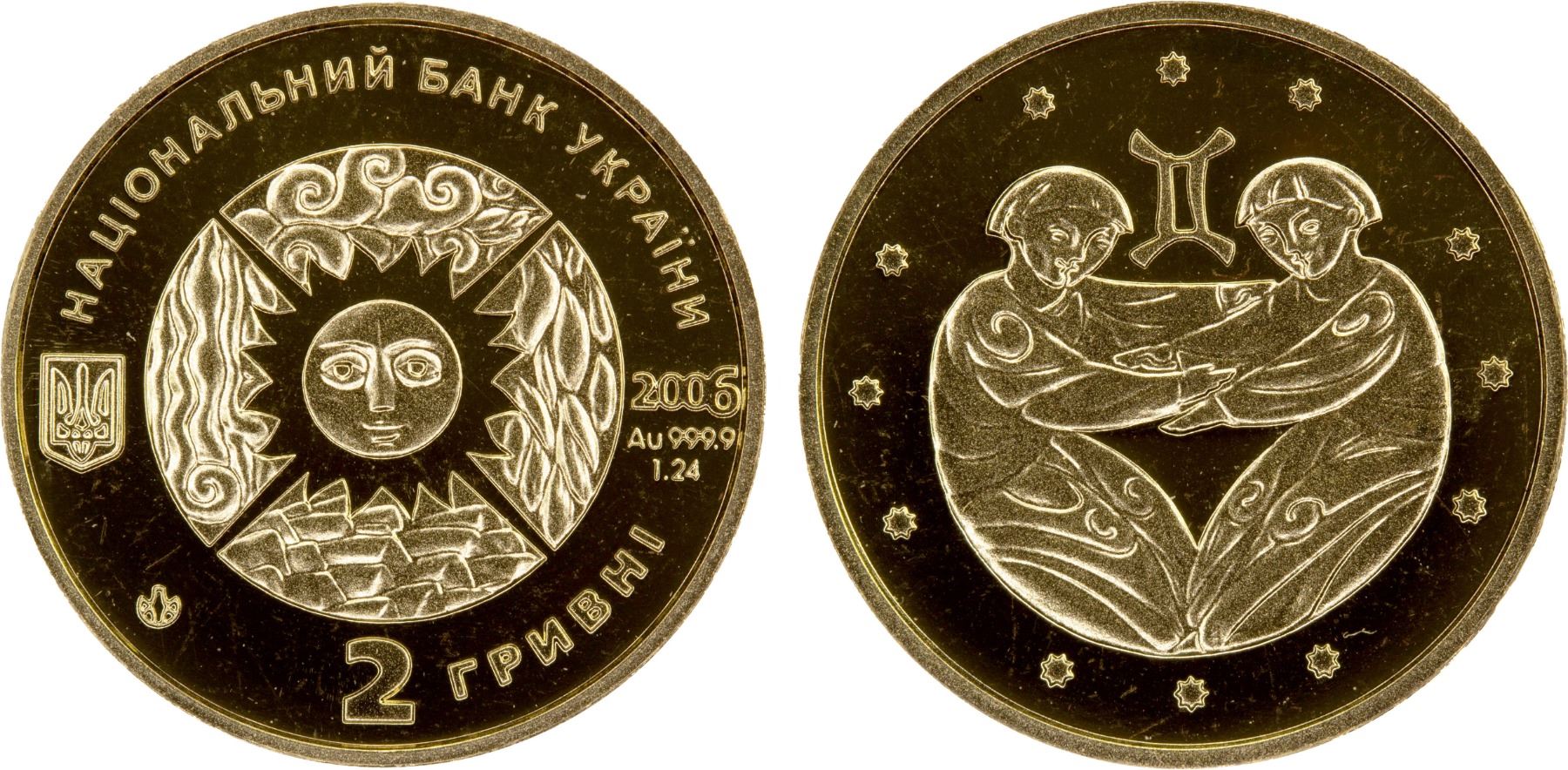 UKRAINE: Republic, AV 2 hryvni, 2006, KM-406, Zahreba-3M.2.7, Signs of the Zodiac Series - Gemini, struck at the Ukrainian mint, Kyiv, Proof. A styled image of Gemini with stars around it is depicted, and its Sign of Zodiac above it.