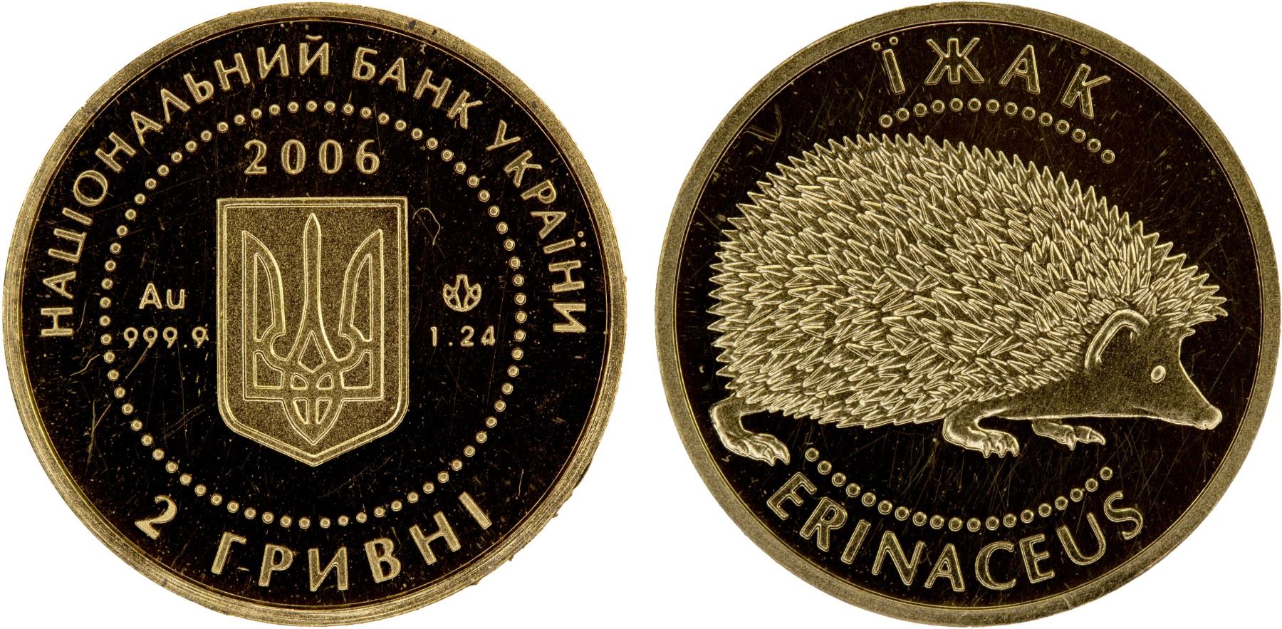 UKRAINE: Republic, AV 2 hryvni, 2006, KM-408, Zahreba-3M.2.5, The Smallest Golden Coin Series - Hedgehog, struck at the Ukrainian mint, Kyiv, Proof.