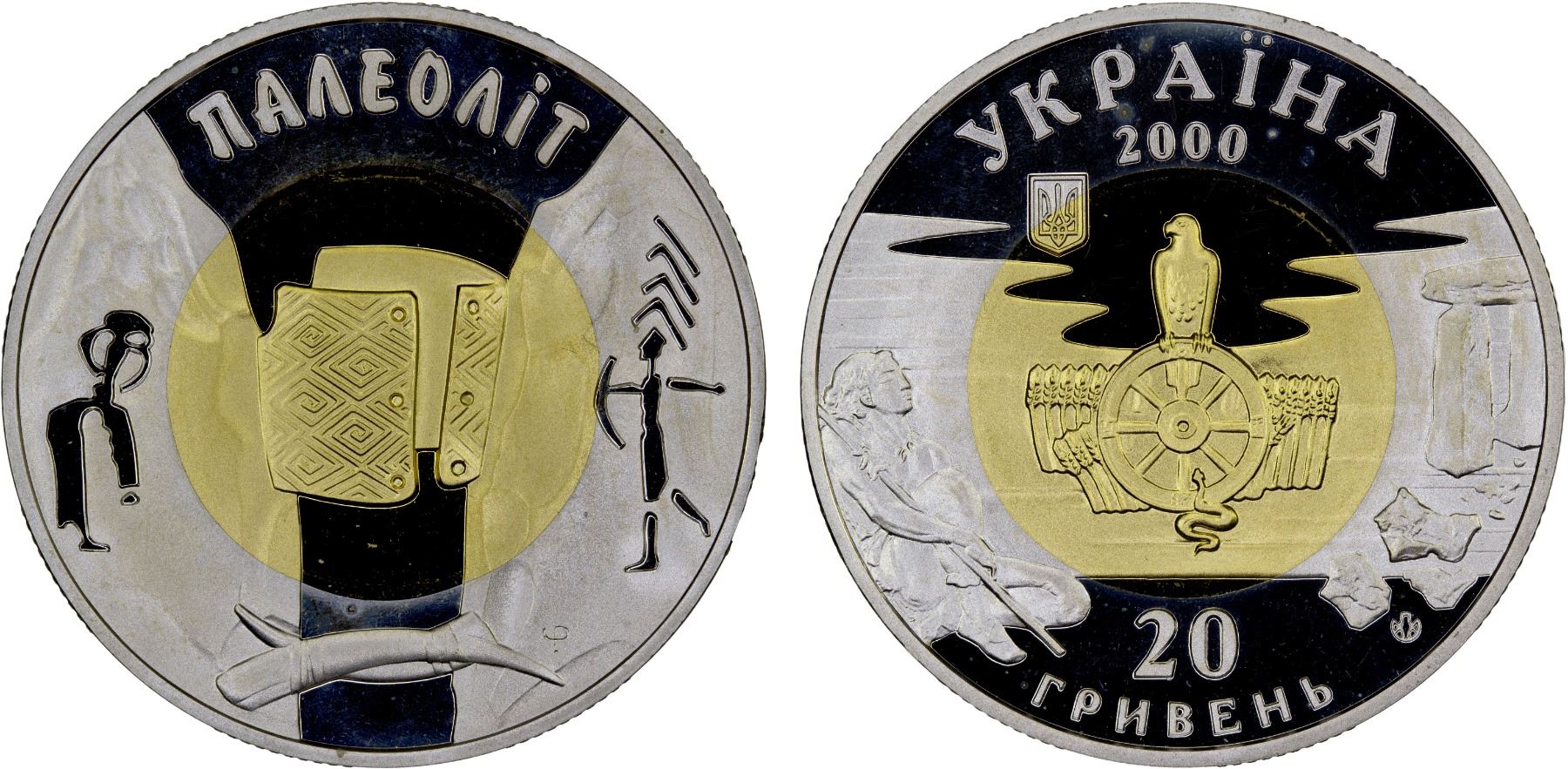 UKRAINE: Republic, AV 20 hryvni, 2000, KM-126, Zahreba-3M.20.1, Monuments of Ancient Cultures of Ukraine Series - Paleolithic (Stone) Age, bimetallic issue with 5.74gm gold (.916) center, and 7.8gm silver (.925) ring, struck at the Ukrainian mint, Kyiv, Proof. A carved Mizyn bracelet made of mammoth tusk is at center; petroglyphic drawings of primitives and the commemorative inscription is on the ring.